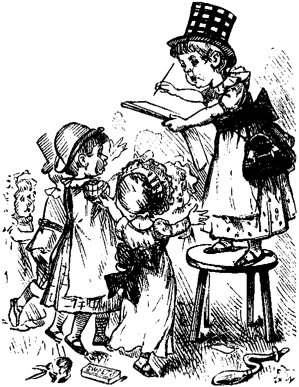 "Mostly about gran' things an' wunnerful things—kings, an' carridges, an' angels, an' firewux, an' dreams what she says she's 'ad. An' she'll sweer they're true. My word, it is wicked of 'er! She's allus pretennin' to be things what she ain't, too. One Sat'dy arf'noon she said she was a steam-injun. An' she got 'old of a little boy, BOB COLLINGS, and said 'e was the tender. An' BOB COLLINGS 'ad to foller close be'ind 'er all that arf'noon, else she'd a' nigh killed 'im. 'E got rather tired, because she kept runnin' about, bein' a express an' 'avin' cerlishuns. Lawst of all she wived 'er awms about, and mide a kind o' whooshin' noise. 'Now,' she said, 'my biler's bust, an' I'm done for!' So she lay flat on the wet groun', an' the tender went 'ome to 'is tea."