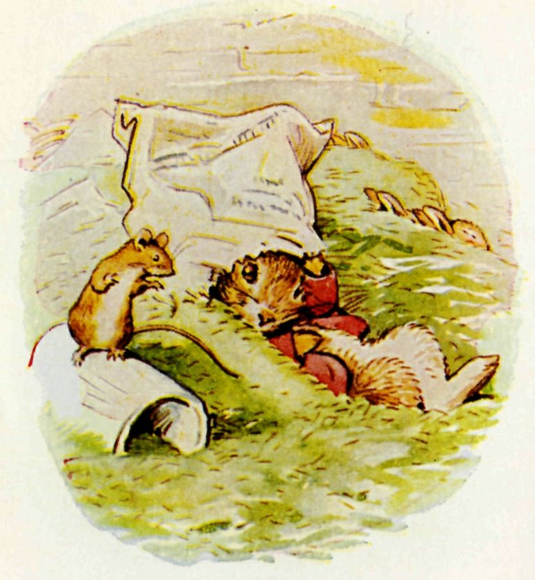 While she and Benjamin were talking, close under the wall, they heard a heavy tread above their heads; and suddenly Mr. McGregor emptied out a sackful of lawn mowings right upon the top of the sleeping Flopsy Bunnies! Benjamin shrank down under his paper bag. The mouse hid in a jam pot.
