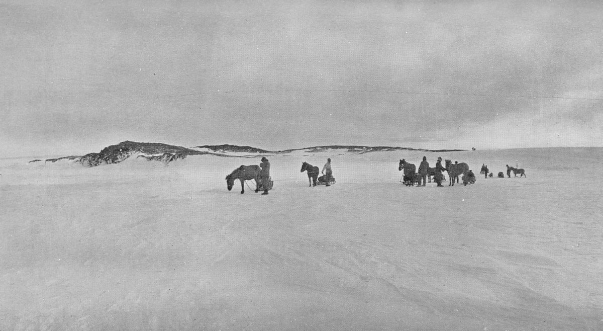 "Evening. Hut Point. We had a most unpleasant experience coming in. We struck wind and drift just about a mile from Hut Point: then we saw there was a small thaw pool off the Point, and came out to give it a wide berth. Atkinson put his feet down into water: we turned sharp out, and then Crean went right in up to his arms, and we realized that the ice was not more than three or four inches of slush. I managed to give him a hand out without the ice giving, and we went on floundering about. Then Crean went right in again, and the sledge nearly went too: we pulled the sledge, and the sledge pulled him out. Except for some more soft patches that was all, but it was quite enough. I think we got out of it most fortunately."