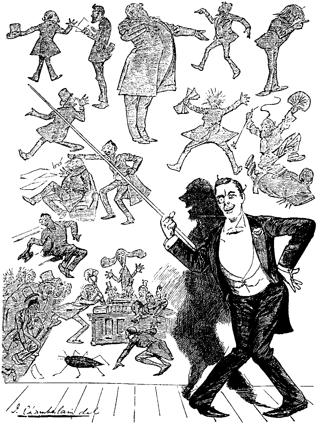Author. Of course the acting is abominable—but they might make allowances for that. It is so unfair! [The Play proceeds. The Heroine's jealousy has been excited by the Villain, for vague purposes of his own, and the Hero is trying to disarm her suspicions. She. "But why are you constantly going from Paris to London at the beck and call of that man?" He (aside). "If she only knew that I do it to shield my second cousin, JASPER—but my oath!—I cannot tell her! (To her.) The reason is very simple, darling—he is my Private Secretary!" (Roars of inextinguishable laughter, drowning the Wife's expressions of perfect satisfaction and confidence. The Hero wants to go out; the Wife begs him to stay; she has 'a presentiment of evil—a dread of something unseen, unknown.' He goes: the Villain enters in evening dress.) Villain. "Your husband is false to you. Meet me in half an hour at the lonely hut by the cross-roads, and you shall have proof of his guilt." (The Wife departs at once, just as she is. Villain, soliloquising.) "So—my diabolical schemes prosper. I have got JOSEPH out of the way by stratagem, decoyed his wife—my early love—to a lonely hut, where my minions wait to seize her. Now to abduct the child, destroy the certificate of vaccination which alone stands between me and a Peerage, set fire to the home of my ancestors, accuse JOSEPH of all my crimes, and take my seat in the House of Lords as the Earl of Addelegg! Ha-ha—a good night's work! a good—" Joseph (from back). "Not so. I have heard all. I will not have it. You shall not!" (&c., &c.) Villain. "You would thwart my schemes?" Joseph (firmly). "I would. My wife and child shall not—" (&c., &c.) Villain (slowly). "And the oath you swore to my Mother, your dying Aunt, would you break that?" Joseph (overcome). "My oath! my Aunt! Ah, no, I cannot, I must not break it. JASPER [pg 166] SHOPPUN, I am powerless—you must do your evil will!" (He sinks on a settee: Triumph of Villain, tableau, and Curtain.)