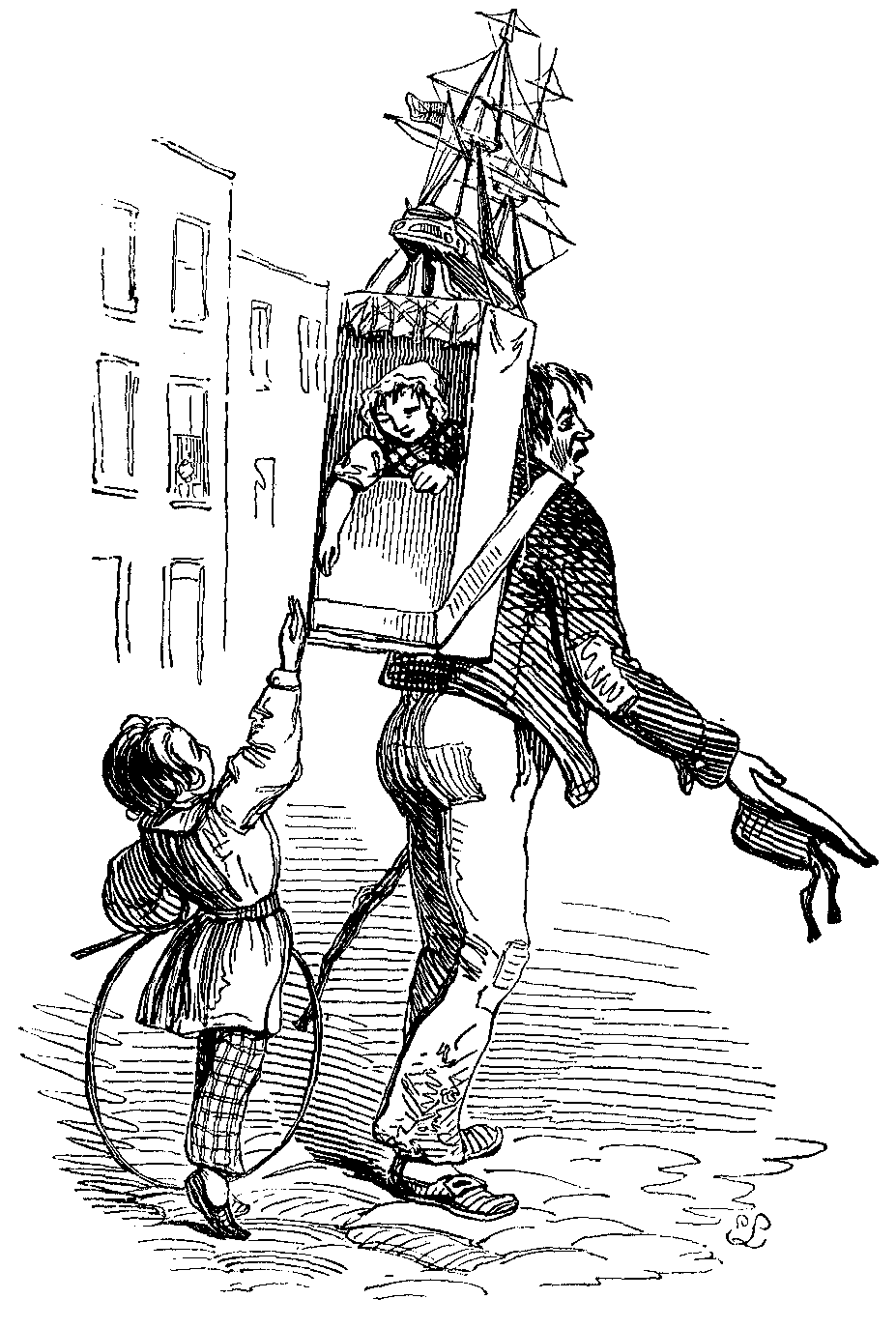 These nautical melodists, with voices as rough as their beards, are to be met with everywhere; but they abound chiefly in the neighbourhood of Deptford and Wapping, where they seem to be indigenous. The most remarkable specimen of the class may, however, frequently be seen about the streets of London, carrying at his back a good-sized box, inside which, and peeping through a sort of port-hole, a pretty little girl of some two years old exhibits her chubby face. Surmounting the box, a small model of a frigate, all a-tant and ship-shape, represents “Her Majesty’s (God bless her!) frigate Billy-ruffian, on board o’ which the exhibitor lost his blessed limb.”