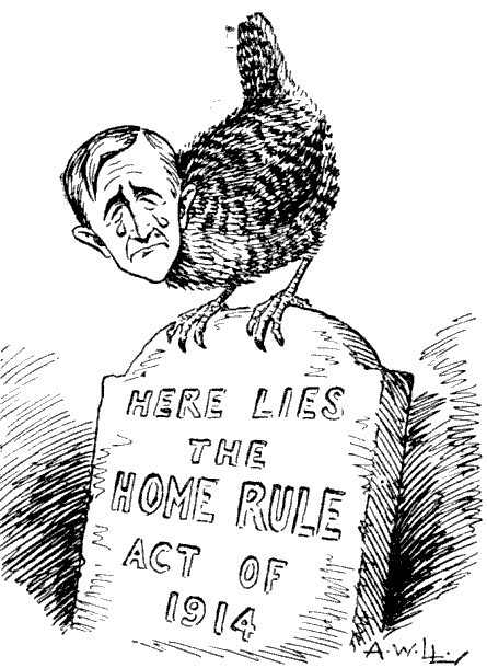 Thursday, July 1st.—Unfortunately the House of Lords does not contain a representative of Sinn Fein and therefore had no opportunity of learning the opinion of the dominant party in Ireland regarding Lord Monteagle's Dominion of Ireland Bill. Other Irish opinion, as expressed by Lords Dunraven and Killanin, was that it would probably cause the seething pot to boil over. Lord Ashbourne made sundry observations in Erse, one of which was understood to be that "Ireland could afford to wait." The Peers generally agreed with him, and, after hearing from the Lord Chancellor that of all the Irish proposals he had studied this contained the most elements of danger, threw out the Bill without a division.