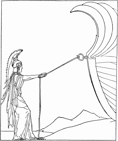 The stranger clasped his hands and went through the gate. And then, as he looked after him Telemachus saw the stranger change in his form. He became first as a woman, tall, with fair hair and a spear of bronze in her hand. And then the form of a woman changed too. It changed into a great sea-eagle that on wide wings rose up and flew high through the air. Telemachus knew then that his visitor was an immortal and no other than the goddess Athene who had been his father's friend.