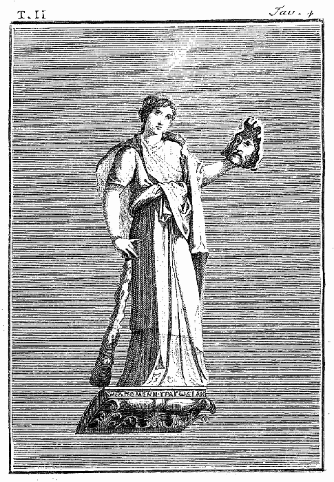L'inscription qu'on lit en grec au-dessous de cette figure la fait connaître avec précision (MELPOMENE, LA TRAGÉDIE). Le peintre, sans s'arrêter aux diverses opinions qui balancent entre cette Muse, Euterpe et Terpsichore, l'empire de la scène tragique, paraît s'être attaché au sentiment qui lui a paru le mieux fondé ou le plus généralement reçu de son temps; c'est aussi celui qui a prévalu. La Muse a la tête ceinte d'un voile, d'une bandelette et d'une couronne; elle est vêtue d'une tunique blanche qui lui recouvre les pieds, et dont les manches s'arrêtent aux coudes, d'un manteau ou grand peplum de même couleur attaché en ceinture, et d'une autre tunique plus courte. On peut remarquer que les tuniques des acteurs tragiques devaient couvrir les pieds, à l'effet de cacher les cothurnes dont la semelle épaisse de plusieurs pouces relevait la taille de l'acteur: cette chaussure est visible dans le bas-relief représentant les neuf Muses, qui est passé du Capitole au Musée Napoléon. Notre Melpomène s'appuie de la main droite sur une massue, et dans la gauche, elle tient un masque tragique. La massue semble allusive aux actions des héros qui font le sujet de la poésie tragique, et rappelle Hercule et ses imitateurs, qui se rendirent célèbres dans l'antiquité.