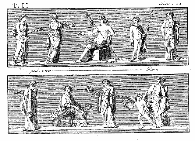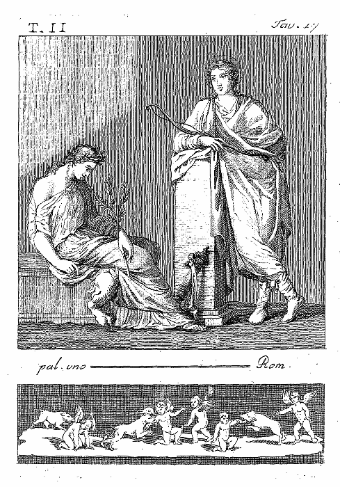Cette peinture et les suivantes, d'égale proportion, furent trouvées ensemble dans les fouilles de Résine, en 1755; les ornemens qu'on voit au bas, sont indépendans des sujets.