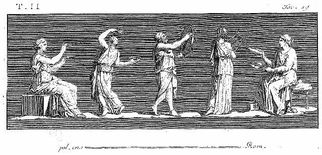 Après Apollon, Considéré comme Dieu des arts et de la poésie, se présentent les Muses, ces aimables divinités auxquelles ont sacrifié les beaux génies de l'antiquité, et dont le culte a été transmis fidèlement jusqu'à nous. Le divin Homère, leur premier favori, les reconnaît au nombre de neuf; Hésiode les nomme dans l'ordre suivant, que nous avons adopté: Clio, Euterpe, Thalie, Melpomène, Terpsichore, Erato, Polymnie, Uranie et Calliope. On a varié souvent dans les attributs qui conviennent à chacune d'elles; aucun monument ne fait mieux autorité que les peintures précieuses de l'antique Herculanum; les inscriptions dont chaque figure est accompagnée fixent toutes les incertitudes; c'est un mérite très-rare, et qui rachète quelques légères négligences qu'on a pu remarquer dans quelques unes d'entr'elles; ces incorrections ont fait penser que l'artiste n'en était pas l'inventeur, mais qu'il les avait copiées d'après d'excellens originaux. En remontant à une plus haute antiquité, ou en supposant des modèles arrêtés, on accorderait ces figures un degré d'authenticité encore plus précieux. Quoi qu'il en soit, cette suite est vraîment inappréciable. On ne doit pas chercher dans les couleurs des draperies, des intentions particulières pour chacune de ces divinités; c'est plutôt l'effet du caprice qu'une allusion mystérieuse. On remarquera, avec plus de justesse, que les tuniques longues (talares), l'agencement modeste des draperies et l'expression douce qui règne dans les traits des Muses, conviennent aux chastes Sœurs. Cette précieuse collection, envoyée en présent par le roi de Naples, orne actuellement le cabinet de l'Impératrice, à la Malmaison.