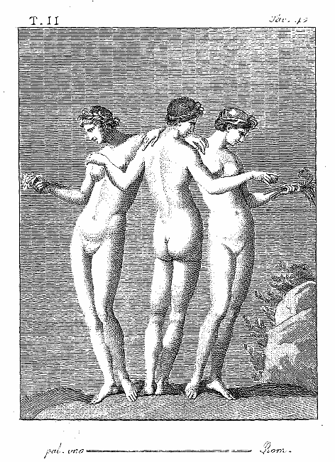 Qui ne reconnaît pas les trois Grâces, n'est pas digne de leurs faveurs. Voici les trois sœurs de l'Amour, les compagnes inséparables de Vénus. De ces Divinités dérivent les bienfaits et la reconnaissance, commerce généreux qu'exprime leur union. (Seneca de Benef. I. 3). Ce sont elles qui font le charme de la beauté; par elles, la beauté plaît en voulant toujours plaire: heureuse condescendance qui rapporte incessamment de nouveaux tributs. «Eh! quelle chose peut jamais être agréable à l'homme sans les Grâces! elles embellissent tout; elles permettent les plaisirs et défendent les excès; amies de la paix, elles défendent sur-tout l'ivresse; elles caressent le sage qui leur sacrifie; elles se montrent nues, car toute Grâce rejette l'ornement». Autrefois elles allaient vêtues (Pausanias. IX. 35); l'Amour leur déroba leurs vêtemens pendant qu'elles étaient au bain (Anth. IV. 19. ép.. 24); mais la décence leur sert toujours de voile; elles sont en présence de Vénus, telles qu'on les voit ici. Ces filles aux belles tresses et toujours fleuries, forment un nœud indissoluble. (Hom. Pind. Hor.) Thalie, opposée aux regards, enchaîne ses deux sœurs, et ses deux sœurs, qui s'offrent de face, lui font un collier de leurs bras. (Pithœus V et. ép. ib. IV. Albricus. cap. V.). Ainsi, dans ce groupe enchanteur, l'œil embrasse la beauté sous tous les aspects. L'une des Grâces tient une pomme, les autres des rameaux et des fleurs: la pomme appartient à Vénus et aux Amours; les fleurs, les feuillages et les fruits sont donnés souvent aux Grâces dans les monumens, et peuvent faire allusion à leur ancienne signification. Elles n'étaient pas, dans la Mythologie primitive, différentes des Saisons. On ne comptait que trois Saisons dans les climats et dans les temps qui ont vu naître les fables; et ces filles de l'année sont, pour la terre et pour tous les vivans, les Ministres des Grâces du ciel.