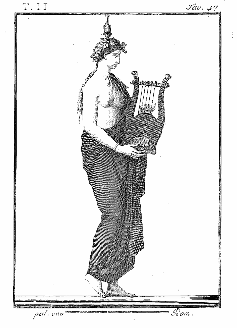 Cette Muse préside à la poésie lyrique, ainsi que l'exprime l'inscription grecque (TERPSICHORE, LA LYRE). Les chants poétiques et les sons harmonieux de son instrument guident les danses sacrées; de son nom de Terpsichore, qui se plaît à la danse. Le chœur des danseurs se portait autour de l'autel, de la droite à la gauche, pour exprimer le mouvement de l'Univers d'orient en occident, et revenait de la gauche à la droite pour figurer le mouvement des planètes d'occident en orient (Luc. de Salt.) Ainsi, l'ode était divisée en strophe et en anti-strophe, qui répondaient dans le chant à ces deux mouvemens. Les hymnes d'Apollon se chantaient en dansant au son de la lyre ou cithare. Aussi Pindare les appelle-t-il puissans par la lyre. Celle que porte notre Muse est montée de sept cordes et se termine par une écaille de tortue; c'est la lyre citée par Horace (testudo), celle inventée par le jeune Mercure, et décrite avec des détails si précieux dans un hymne Homérique. La Muse est vêtue d'une tunique longue, de couleur changeante, n'ayant que la manche gauche comme pour laisser plus de liberté au bras droit; son manteau est bleu, et sa chevelure est retenue par une bandelette et une couronne de laurier.