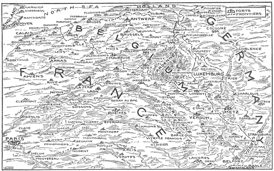 But he hoped within such time the French or British would march to his relief. Thus his chief concern was for the forts protecting the railway leading from Namur down the Meuse Valley into Liege—the line of a French or British advance.