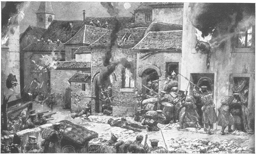 A hot and oppressive day disclosed woods rent and scarred, standing wheat fields shell-plowed and trampled, and farm houses set ablaze. The bringing of the Belgian wounded into Liege apprised the citizens that their side had also suffered considerably. Meanwhile, the Germans were reenforced by the Tenth Hanoverian Army Corps, from command of which General von Emmich had been detached to lead Von Kluck's vanguard, also artillery with 8.4-inch howitzers.