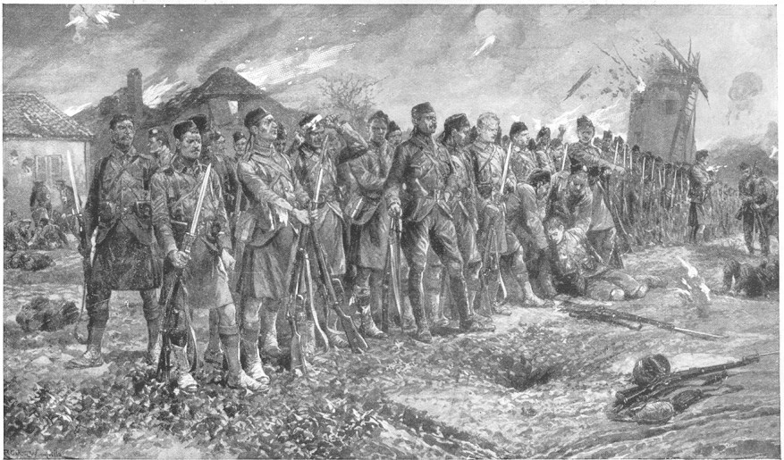 And just before dark, along the roads from the eastward, came the distant cheers from the advancing columns. An officer dashed up on horseback shouting encouragement to the battered men in the trenches. A cheer arose, which rolled up and down the line. Again it rose, then, even before it had died out, with wild yells the Serbians sprang over their breastworks and swept madly across the intervening space to the Austrian lines; smashing through cornfields, over rocks, through the tall grass of orchards. At their heels followed the reenforcing soldiers, though they had that day marched nearly sixty miles. Over the Austrian breastworks they surged, like an angry wave from the sea, their bayonets gleaming in the sunset glow. It was the kind of fighting they knew best; the kind that both Serbians and Bulgars know best, the kind they had practiced most.