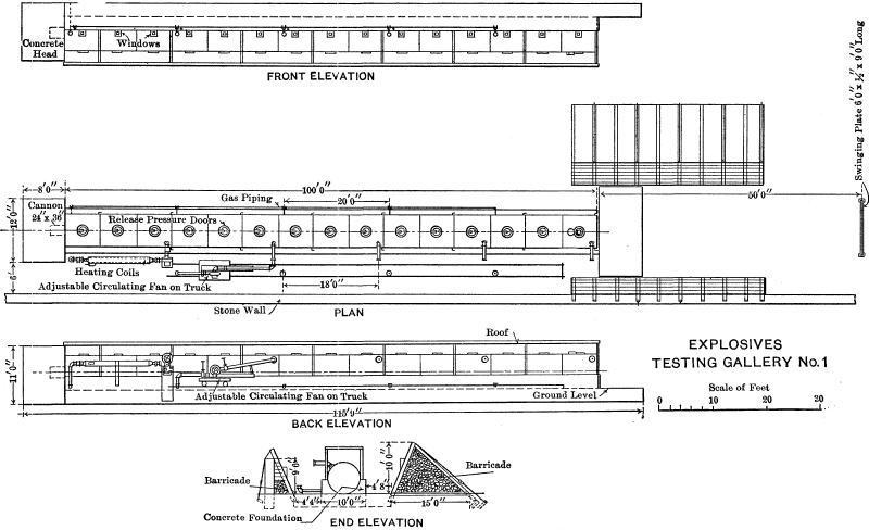 One building (No. 17) is devoted to the smaller physical tests of explosives. It was rendered fire resistant by heavily covering the floors, ceiling, and walls with cement on metal lath, and otherwise protecting the openings. In it are installed apparatus for determining calorific value of explosives, pressure produced on ignition, susceptibility to ignition when dropped, rate of detonation, length and duration of flame, and kindred factors. Elsewhere on the grounds is a gallery of boiler-steel plate, 100 ft. long and more than 6 ft. in diameter, solidly attached to a mass of concrete at one end, in which is embedded a cannon from which to discharge the explosive under test, and open at the other end, and otherwise so constructed as to 197 simulate a small section of a mine gallery (Fig. 2, Plate VI). The heavy mortar pendulum, for the pendulum test for determining the force produced by an explosive, is near by, as is also an armored pit in which large quantities of explosive may be detonated, with a view to studying the effects of magazine explosions, and for testing as to the rate at which ignition of an explosive travels from one end to the other of a cartridge, and the sensitiveness of one cartridge to explosion by discharge of another near by.