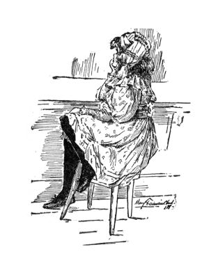 However, that did not interfere with her making a bit of a picture, perched up there on the roof beside Tom, among her burs and her flowers and her moss, her face all dimples from forehead to chin.