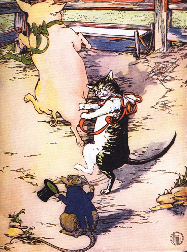 So after her children were fed and made sweet and fresh for the day, she hunted up the Pig, the Cat and the Rat.