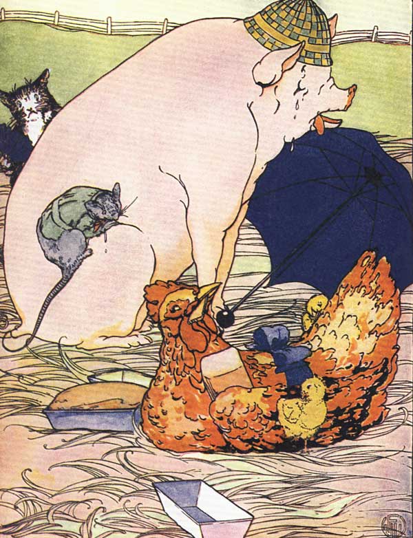 But the Pig, with a grunt, said, “Not I,” and the Cat, with a meow, said, “Not I,” and the Rat, with a squeak, said, “Not I.”