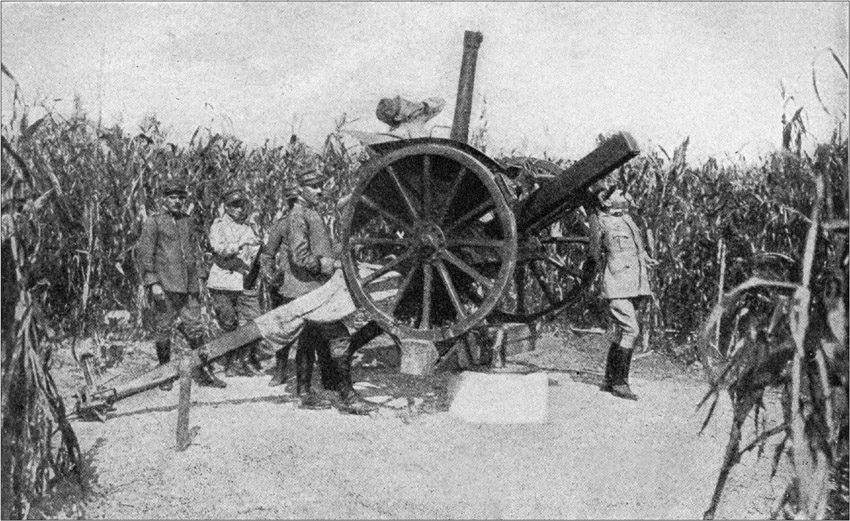 The gunners of an Italian anti-aircraft battery sight an Austrian airplane.