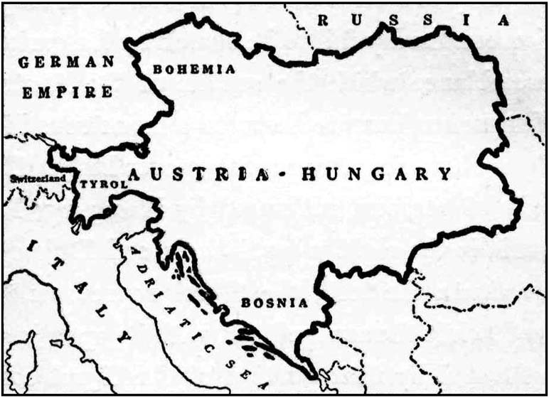 To understand why Italy is at war you have only to look at the map of Central Europe. You can hardly fail to be struck by the curious resemblance which the outline of the Austro-Hungarian Empire bears to a monstrous bird of prey hovering threateningly over Italy. The body of the bird is formed by Hungary; Bohemia is the right wing, Bosnia and Dalmatia constitute the left; the Tyrol represents the head, while the savage beak, with its open jaws, is formed by that portion of the Tyrol commonly known as the Trentino. And that savage beak, you will note, is buried deep in the shoulder of Italy, holding between its jaws, as it were, the Lake of Garda. To continue the simile, it will be seen that the talons of the bird, formed by the Istrian Peninsula, reach out over the Adriatic in threatening proximity [38]to Venice and the other Italian coast towns. It is to end the intolerable menace of that beak and those claws that Italy is fighting. There you have it in a nutshell.