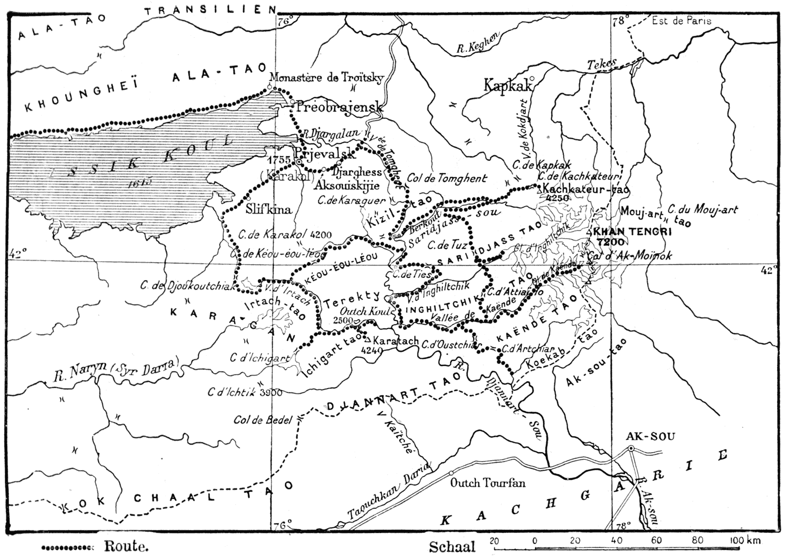 Het dal Kizil-Tao heeft zijn naam te danken aan de kleur der steenen die daar worden gevonden. Kizil beteekent in de taal der Kirghizen rood, en Tao steen; het is dus het dal der roode steenen. De dalen, toppen en passen van den Tiensjan ontleenen allen hun namen aan de kleuren of vormen van sommige voorwerpen, wier grilligheid de verbeelding der inwoners heeft getroffen. Twee valleien monden in het dal van Kizil-Tao uit, dat grootendeels onbewoond is; rechts die van Otrouk, en links die van Berkout, welke naar het plateau van Saridjass voert. In den bergwand, die het Kizil-Tao-dal scheidt van het dal Keou-eou-leou, opent zich de Torpeu-pas (3066 M.) van waar men een uitgestrekt berglandschap overziet. Deze doorgang, die niet op de russische kaarten is aangegeven, is de meest gebruikelijke weg voor de nomaden, die het dal van Kizil-Tao doortrekken.