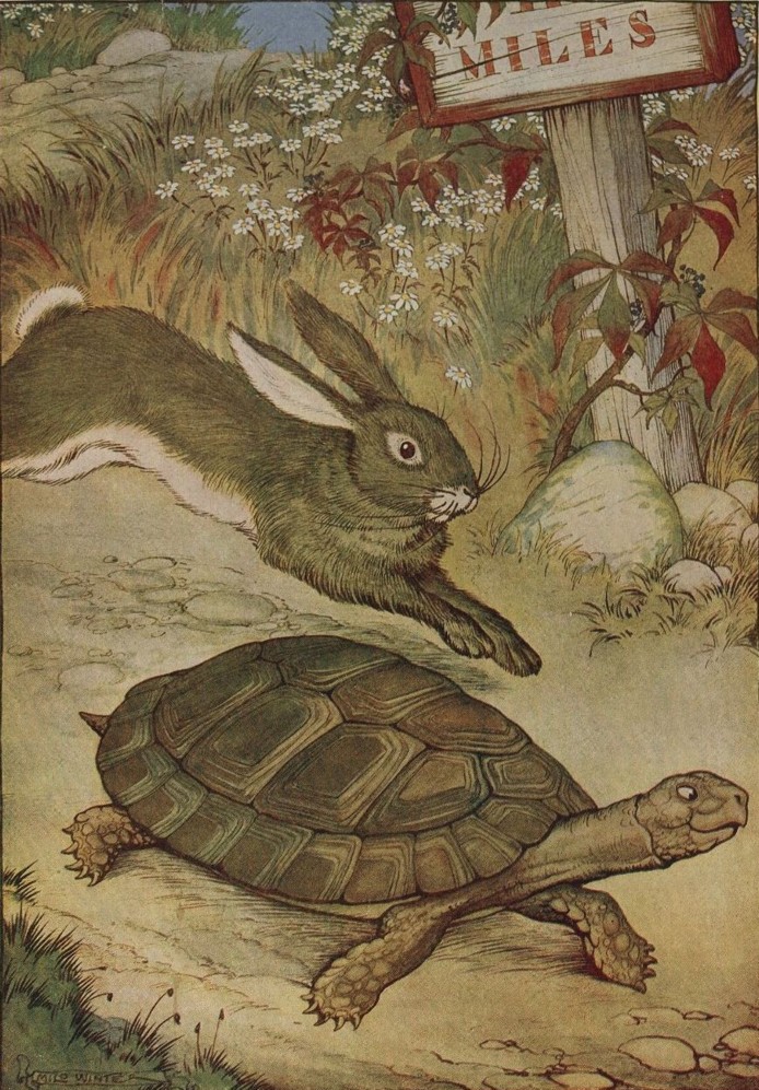 And when he came out of the warren in the early morning sunshine, and there saw the shadow cast by his long and pointed ears, a terrible fright seized him.