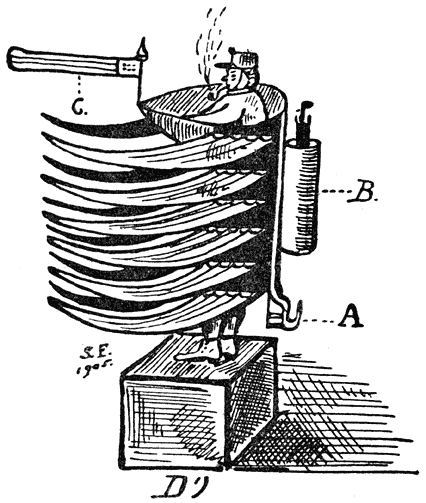 Mijne verdere motieven zijn: b) .... Bij de derde teekening op pag. 44 beweerde de uitgever, dat hij nooit last had van haartjes, als-ie ’n nieuwe pen gebruikte. De haartjes om de harige maansikkel, wilde hij bij ontstentenis van inktstuf met de scherpe punt van ’n voorsnijmes verwijderen. Ik verzette mij tegen dat ingrijpen in artistieken arbeid. Wáár moet het heen met de zelfstandigheid eens artiests, als ’n werkgever hem achter de schermen met de punt van ’n voorsnijmes blameert? Verkoopen wij kunstenaars onze ziel? Ik weerde de punt af, won het pleit mèt krakeel. Motief c) .... Bij de teekening op pag. 50, uitte ’k mijn wrok op bedekte wijze, door te zinspelen op [190n]een “provinciaal deskundige” die beweerd had dat mijn schoorsteen niét bestond, en gaf ik bizonder scherp te kennen, dat ’k voor zùlke lieden niet teekende. Bij de teekening op pag. 61 moest ’k dit aandikken. Immers aan ’t slot der noot achtte ik mij zedelijk verplicht te melden: “Enfin, de uitgever moet ’t weten. Ik houd mij koel en ’r buiten.” Deze toespeling, alsmede de critiek die ik mij veroorloofde, op de waarlijk stuitende woorden van den auteur, maakte de Bussumsche heer zóó verbolgen, dat hij alweder wilde snoeien, en mij eenige keeren in de Kalverstraat te Amsterdam voorbij liep zonder den hoed af te nemen. Te deksel, als wij schrijvers en illustratoren in het zweet van ons aanschijn, de uitgevers aan hoeden hèlpen—mogen we dan niet verlangen, dat tegenover ons de burgerlijke beleefdheid in acht worde genomen? Mag ik als verluchter geen diepgevoelde meening neerschrijven over den auteur Falkland, wiens populariteit een hoon is voor alles wat schoone geschriften produceert? Te deksel.... De strijd, in het stadium gekomen van het elkaar niet meer groeten, werd er intenser op. Motief d) .... Bij de inderdaad heerlijke teekening op pag. 71 schreef mij de tegenpartij: “Wat beteekent toch, mijnheer, de eierdop waaruit de vlammen slaan?” Om nadere informaties verzoekend, bleek mij dat de kunstkenner de teekening ondersteboven had gehouden. Men zwijgt hooghartig bij zulke enormiteiten. Bij wijze van terechtwijzing, antwoordde ’k (pag. 71) ... “helaas de heele tijd is vol van leeken, die hun opinies over alles en nog wat publiceeren.” “Welk een afschuwelijke samenwerking, nietwaar lezeres? Ieder teekenaar zou er op die manier de brui aan geven. Nòg was ’t einde niet daar. Motief e) .... Op pag. 106, ter hoogte der uitnemende illustratie van hemd en toren, berichtte ik reeds de uitspraak: “.... Schei in ’s hemels naam uit met dat geknoei, dat mij per vierkanten centimeter cènten kost...” ...., eene grofheid van zóó ongewoon gehalte, dat men z’n nagels van woede zou bebijten, zoo men daar aanleg toe had. Ook gaf de vergissing van het P. Z. 12 tot veel [191n]onheusche opmerkingen aanleiding. Ik draag frontjes, vind het derhalve niet zulk een hevige fout, als men zich in het merk van een overhemd vergist. Vertoornd zeide ik tot den uitgever: “Fiche moi la paix!”.... Toen, bij de teekening op pag. 113, meende mijn tegenstander geestig te zijn, door een paar inktmoppen, mijner ontroerde pen ontvallen, mede in het cliché op te nemen. Men doet zoo iets niet. Het is buiten de perken van het welvoegelijke. De grootste artisten: Steinlen, Léandre, Ibels, Veth, Roland Holst, Hoytema, Crane, Whistler enz. hebben wel eens moppen op ’t papier laten regenen. Mijn collega Toorop stiet onlangs een kop waterchocola naast het verrukkelijk portret van een pastoor. Zou in zulk een geval de uitgever niet schaamteloos gehandeld hebben, als hij die chocolade-klodders hadde aangebracht? Bevend van verontwaardiging, onmachtig tegenover willekeur, weigerde ik de achtste en negende kapittels te verrijken. Ziehier het overzicht—vrij van scheldwoorden, uitsluitend gebaseerd op gezond verstand—van de onverkwikkelijke verhouding tusschen een kunstenaar en een zakenman. En na al de onaangenaamheden mìj aangedaan—welke vreemde opvattingen hebben onze belagers toch!—had deze heer nog de vrijmoedigheid, mij een week geleden op dringende wijze te verzoeken zijn portret voor dezen bundel te teekenen. Ik weigerde meelijdend doch beslist. Het zou te zot worden. Om hem daaromtrent nog eens goed mijne opinie te zeggen, had ik er zeker genoegen in, voor slot-teekening den nièt in mijn geest schrijvenden, afstootenden auteur van dit boek (hoe vindt zoo iets ’n uitgever en ’n lezerskring?) op zinnebeeldige wijze voor te stellen. Klompen-gedoe.
