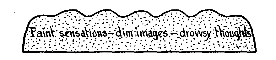 The Wave in the Stream of Consciousness.—The surface of our mental stream is not level, but is broken by a wave which stands above the rest; which is but another way of saying that some one thing is always more prominent in our thought than the rest. Only when we are in a sleepy reverie, or not thinking about much of anything, does the stream approximate a level. At all other times some one object occupies the highest point in our thought, to the more or less complete exclusion of other things which we might think about. A thousand and one objects are possible to our thought at any moment, but all except one thing occupy a secondary place, or are not present to our consciousness at all. They exist on the margin, or else are clear off the8 edge of consciousness, while the one thing occupies the center. We may be reading a fascinating book late at night in a cold room. The charm of the writer, the beauty of the heroine, or the bravery of the hero so occupies the mind that the weary eyes and chattering teeth are unnoticed. Consciousness has piled up in a high wave on the points of interest in the book, and the bodily sensations are for the moment on a much lower level. But let the book grow dull for a moment, and the make-up of the stream changes in a flash. Hero, heroine, or literary style no longer occupies the wave. They forfeit their place, the wave is taken by the bodily sensations, and we are conscious of the smarting eyes and shivering body, while these in turn give way to the next object which occupies the wave. Figs. 1-3 illustrate these changes.