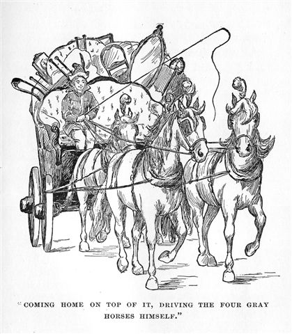 The next day they both felt very miserable, and the woodman had such a terrible headache that he could neither eat nor work; but the day after, being pretty well again, he dug up some more gold and went to town, where he bought such quantities of fine clothes and furniture and so many good things to eat, that in the end he was obliged to buy a wagon to bring them home in, and great was the delight of his wife when she saw him coming home on the top of it, driving the four gray horses himself.