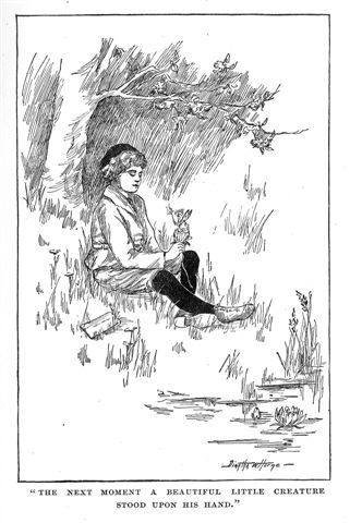 "After this double crime no mercy can be shown you," said the Lizard, and she twined her scarlet tongue round him, and drew him through the hole to herself. At the same instant it closed, and a crack came in the roof of the cave, through which the sunshine stole, and as Hulda looked up in flew a brown moth and settled on the magic bracelet. She touched the moth with the wand, and instantly it stood upon her wrist—a beautiful and joyous fairy. She took her wand from Hulda's hand, and stood for a moment looking gratefully in her face without speaking. Then she said to the wand: