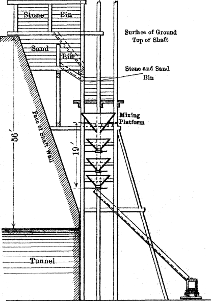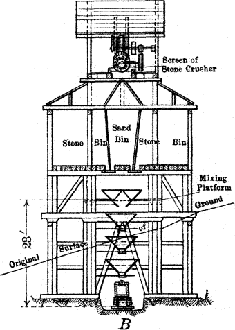 A Cross-Section of Hains Mixer Installation, at Weehawken Shaft B Cross-Section of Hains Mixer Installation, Stone and Sand Bins Above and Screen of Crusher, at Hackensack Portal |