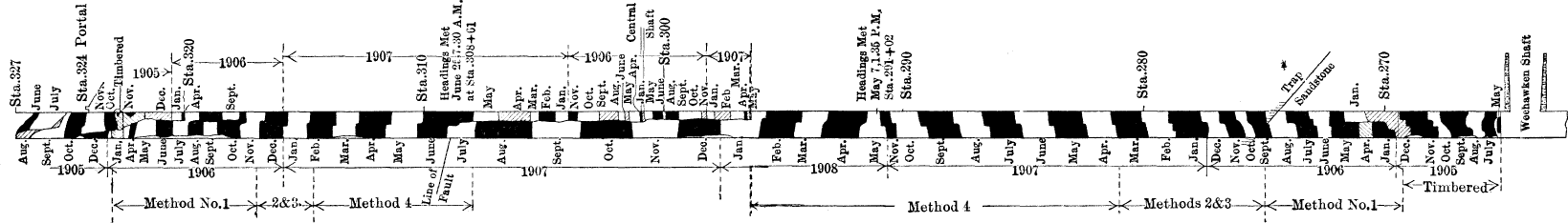 Geology.—Starting west from the Weehawken Shaft, the tunnels pass through a wide fault for a distance of nearly 400 ft., this fault being a continuation of that which forms the valley between the detached mass of trap and sandstone known as King’s Bluff, which lies north of the tunnels, and the main trap ridge of Bergen Hill.