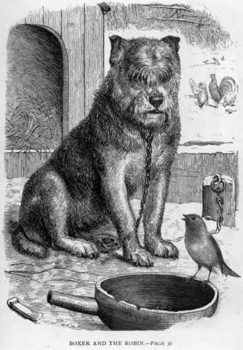 At last Boxer got the prickly thing close to the bank, and over it rolled right down into an old rabbit’s hole, where the dog could not reach it; so then he turned round and ran at the first thing he saw, which happened to be the magpie, who stayed so long upon the ground before flying up, that the dog got hold of one of his tail-feathers.