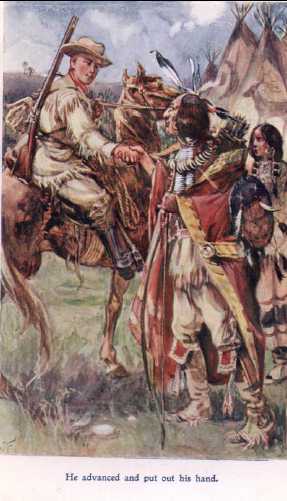 In a short time several persons appeared; and on seeing us one of them came forward, habited in the costume of a chief, a quiver at his back and a bow in his hand. A squaw followed him. He stopped and gazed at me. Then, as I rode on, he advanced, and, putting out his hand, exclaimed—