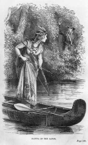“We have time, at all events, to choose our ground,” said Captain Audley, looking round; “yonder tree by the river’s bank will serve our purpose, and at the last, should your ammunition fail, and my arrows all be shot away, we may plunge into the stream and swim along it till we gain the opposite bank, whence we can float down the current on a raft till we meet our countrymen, encamped, as I hear, some leagues on—though I know not their exact position.” This was said as they were making their way towards a huge tree the roots of which projecting far into the water, left the ground on the near side sufficiently smooth to enable them to slip round it for the purpose of firing. As they had seen the Indians, they knew that they must themselves have been discovered. They had but little time to wait, for the savages with loud cries were rapidly approaching, exhibiting on their spears the scalps they had that morning taken from their unsuspecting foes, surprised in the village.