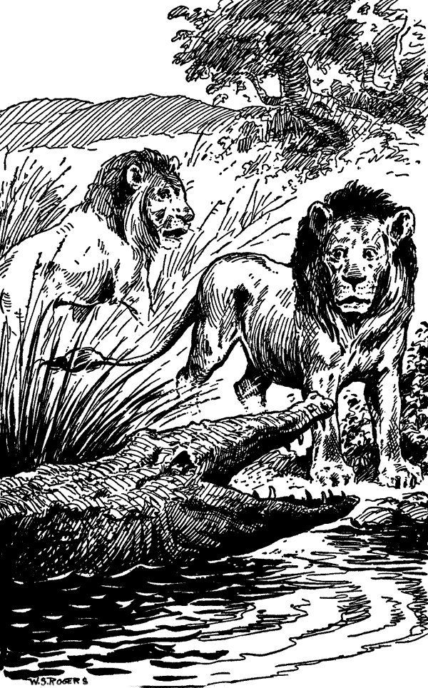 Now please don't imagine, just because these lions growled, that they were cross. They weren't anything of the sort. That was just their way of talking. Your dog barks and growls, and that is his way of speaking. Your cat mews and sometimes growls or "spits," and often purrs, especially when you tickle her ears. And a lion always growls when he talks. When he is angry he roars—that's the difference. And, I almost forgot, lions can purr, too, only it sounds like a buzz saw instead of the way your cat purrs. But then a lion's throat is very big, and so his purr has to be big also.