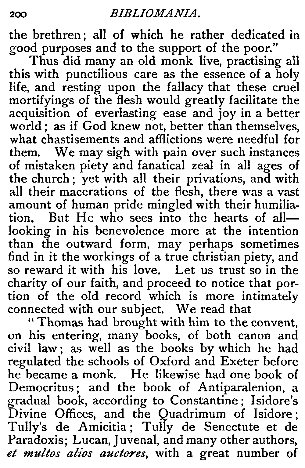 But, leaving these things, I have only to deal with such remains as relate to the love of books in those times. I would show the means then in existence of acquiring knowledge, the scarcity or plentitude of books, the extent of their libraries, and the rules regulating them; and bring forward those facts which tend to display the general routine of a literary monk, or the prevalence of Bibliomania in those days.