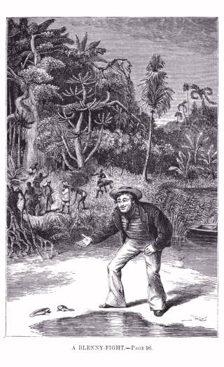It was fortunate for the wrecked voyagers that the set of the current had carried portions of their vessel to the shore, at a considerable distance from the spot where they had landed, because a band of natives, armed with spears and bows and arrows, had watched the wreck from the neighbouring heights, and had hastened to that part of the coast on which they knew from experience the cargo would be likely to drift. The heads of the swimmers being but small specks in the distance, had escaped observation. Thus they had landed unseen. The spot was near the entrance to a small river or creek, which was partially concealed by the formation of the land and by mangrove trees.