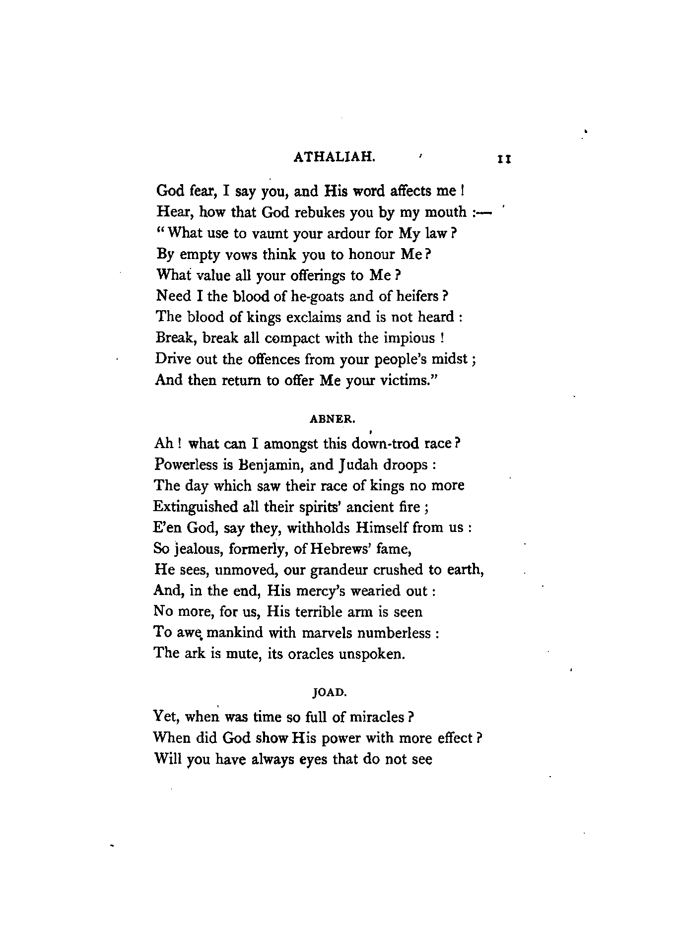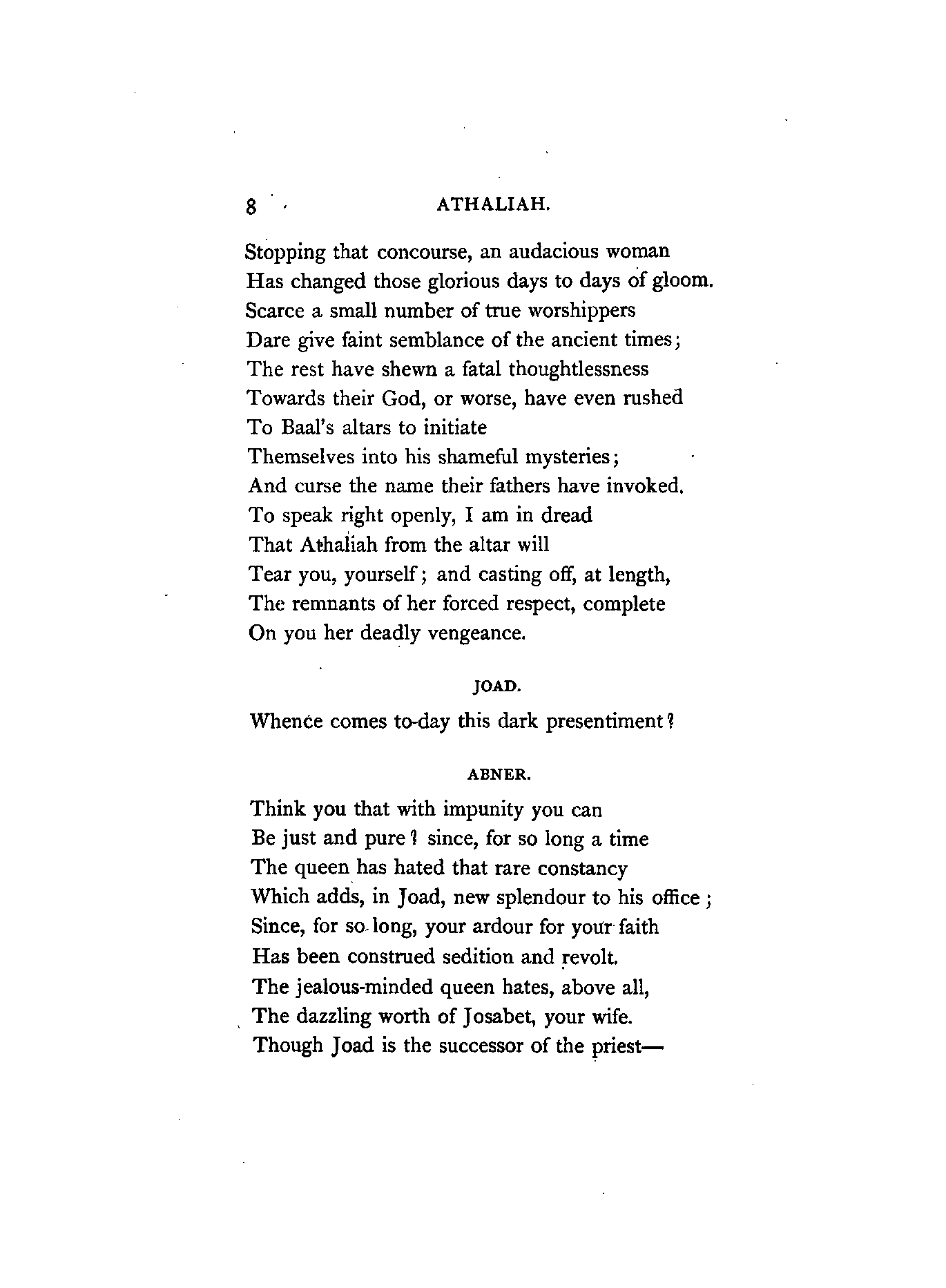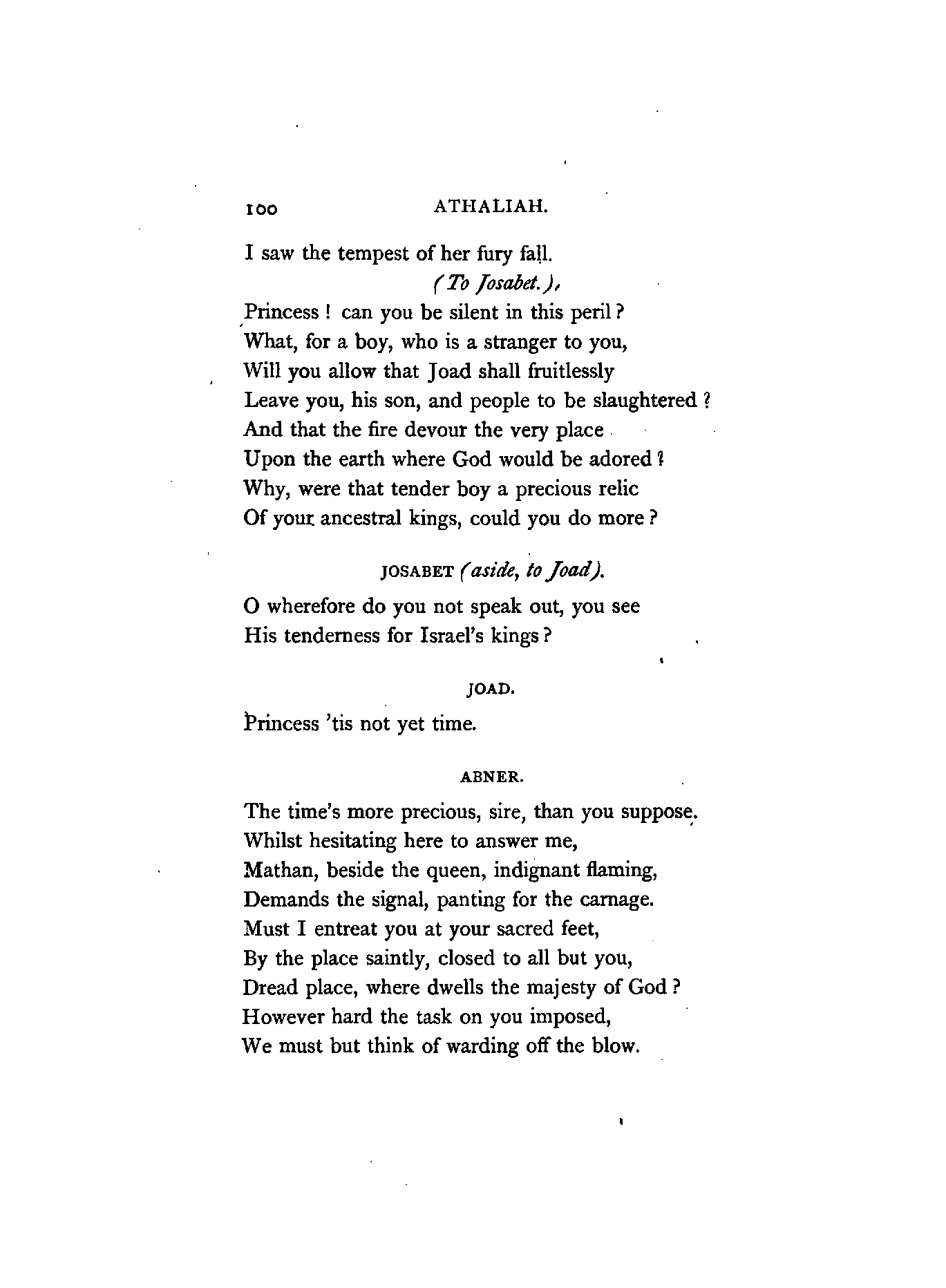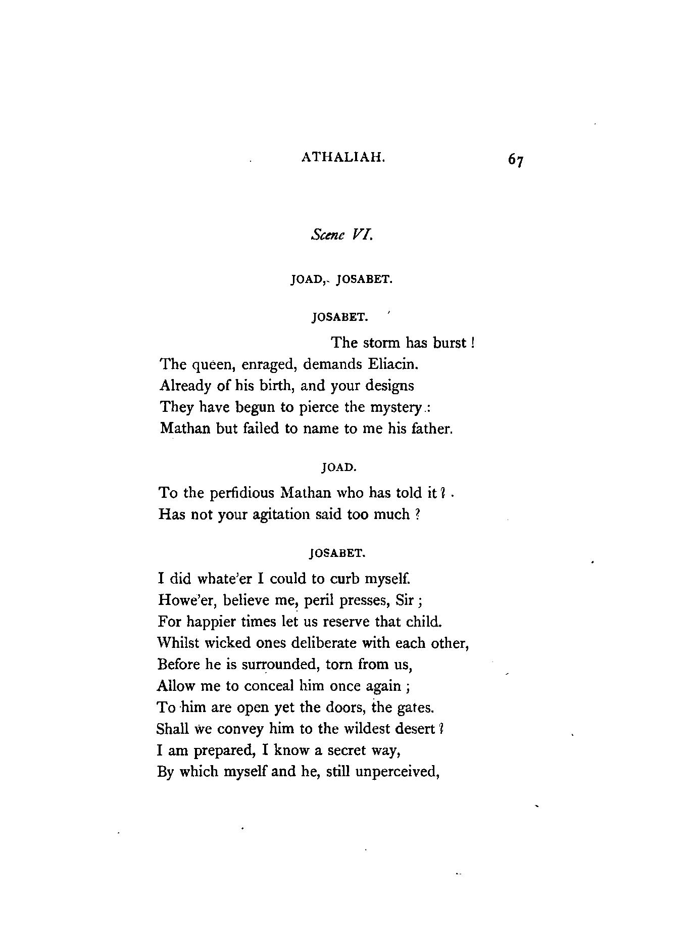 Racine, the author of Athalie (Athaliah), flourished in the latter half of the 17th century. At his appearance, Corneille, the great French Dramatist, was in the full splendour of his fame, whose rival he was afterwards recognised to be. Athalie is a Tragedy in rhyme, consisting of six Iambic feet, similar to the Alexandrine verse found occasionally in our English poets at the termination of a sentence or paragraph. Dryden, and a few others of less note, in the reign of Charles IL, introduced the rhyming drama to the English public; but the clank of its fetters was unpleasant to the British ear, which had become attuned to the freedom and majesty of blank verse. Blank verse, therefore, being our recognised vehicle of dramatic productions, has been employed in this translation. I did, however, intend in the first place to render the chorus into rhyme; but after maturer consideration it appeared to me that irregular blank verse would be more capable of tragic expression; and that it would also be more in harmony with the [4]Hebrew rhythm as represented by the scriptures, from which the plot was appropriated.