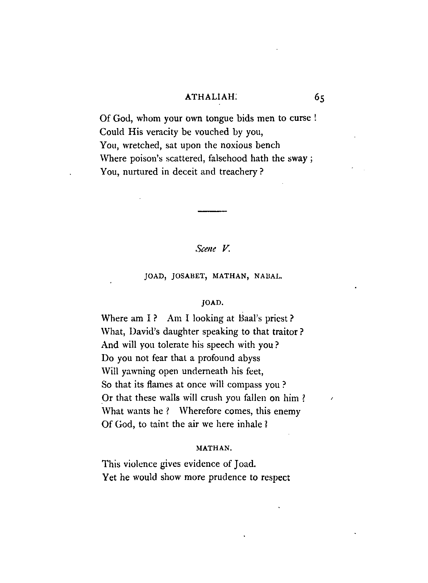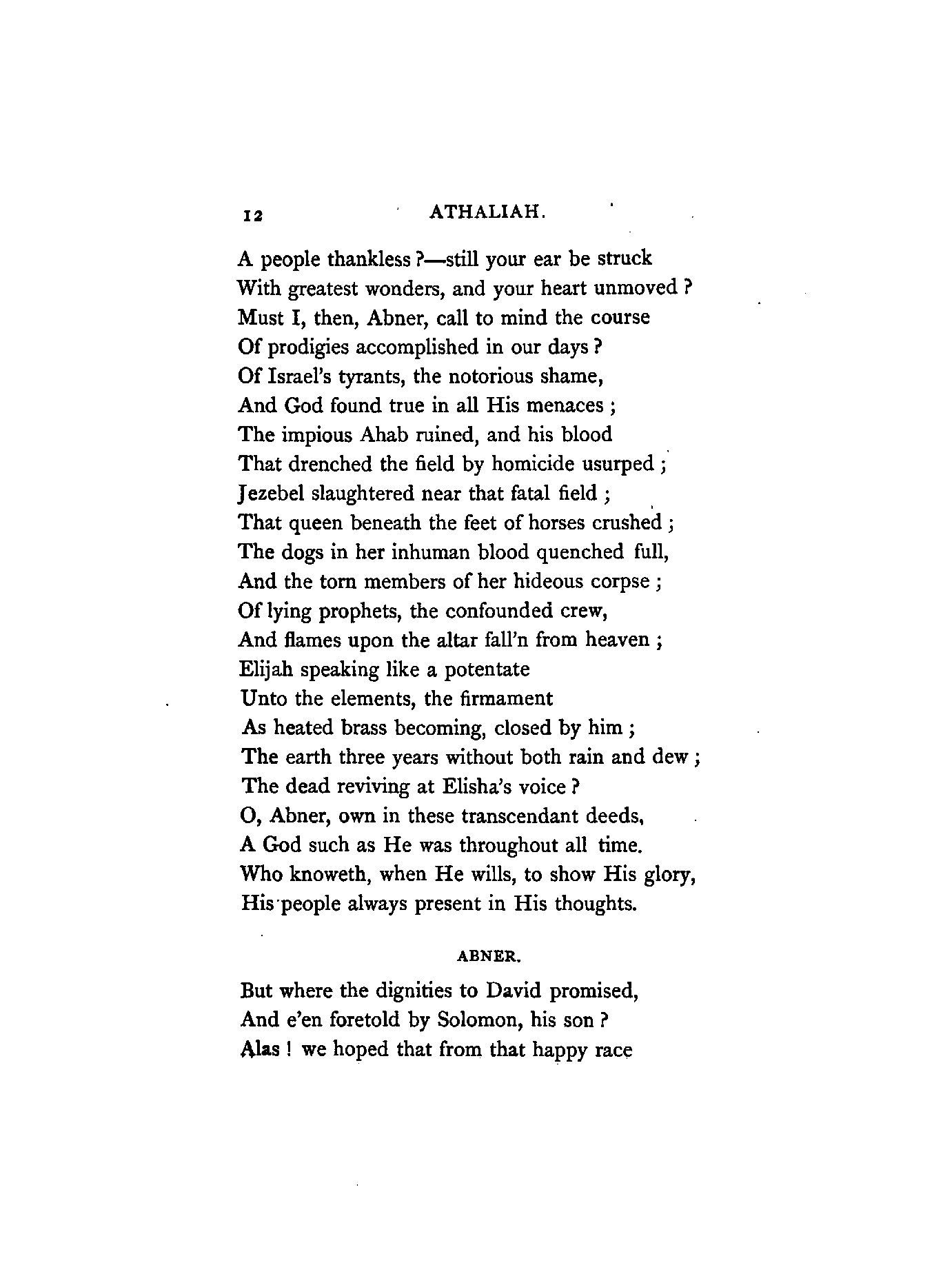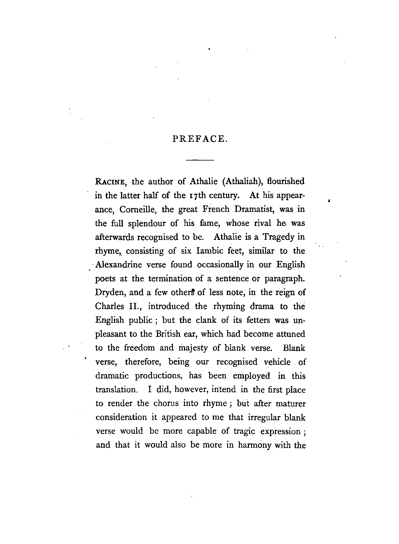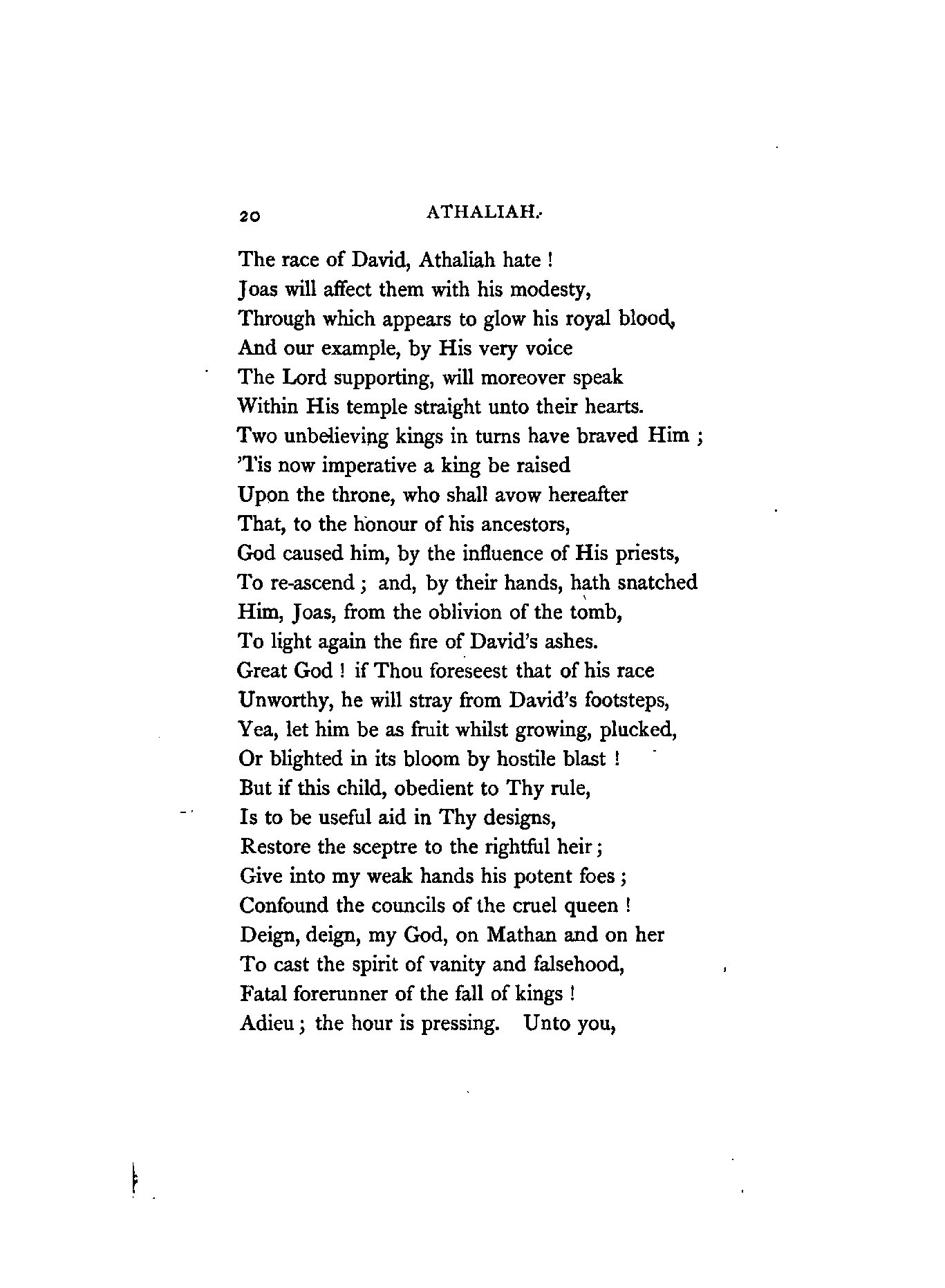Racine, the author of Athalie (Athaliah), flourished in the latter half of the 17th century. At his appearance, Corneille, the great French Dramatist, was in the full splendour of his fame, whose rival he was afterwards recognised to be. Athalie is a Tragedy in rhyme, consisting of six Iambic feet, similar to the Alexandrine verse found occasionally in our English poets at the termination of a sentence or paragraph. Dryden, and a few others of less note, in the reign of Charles IL, introduced the rhyming drama to the English public; but the clank of its fetters was unpleasant to the British ear, which had become attuned to the freedom and majesty of blank verse. Blank verse, therefore, being our recognised vehicle of dramatic productions, has been employed in this translation. I did, however, intend in the first place to render the chorus into rhyme; but after maturer consideration it appeared to me that irregular blank verse would be more capable of tragic expression; and that it would also be more in harmony with the [4]Hebrew rhythm as represented by the scriptures, from which the plot was appropriated.