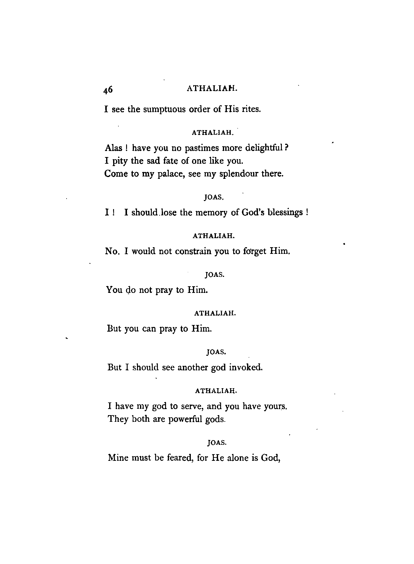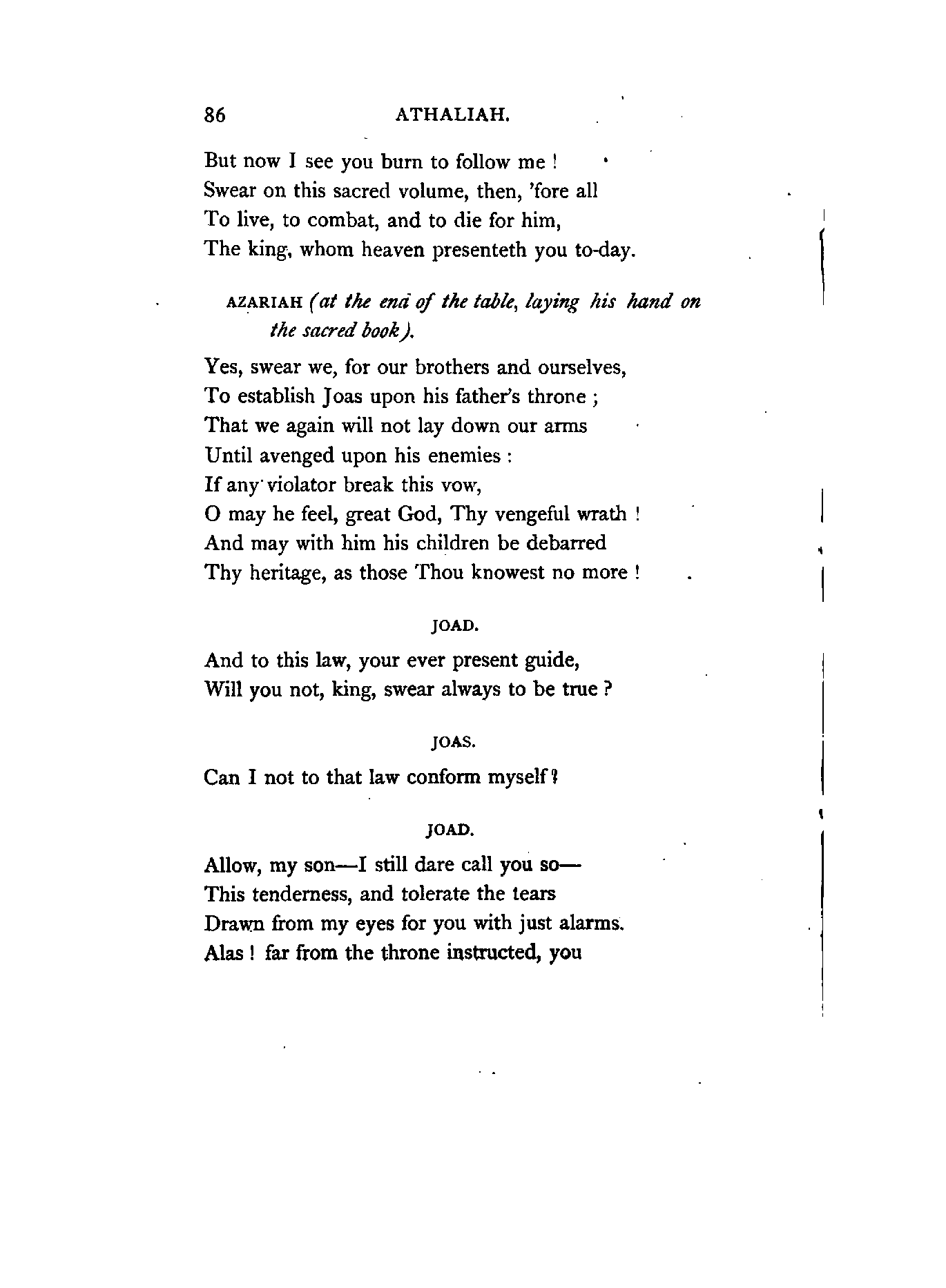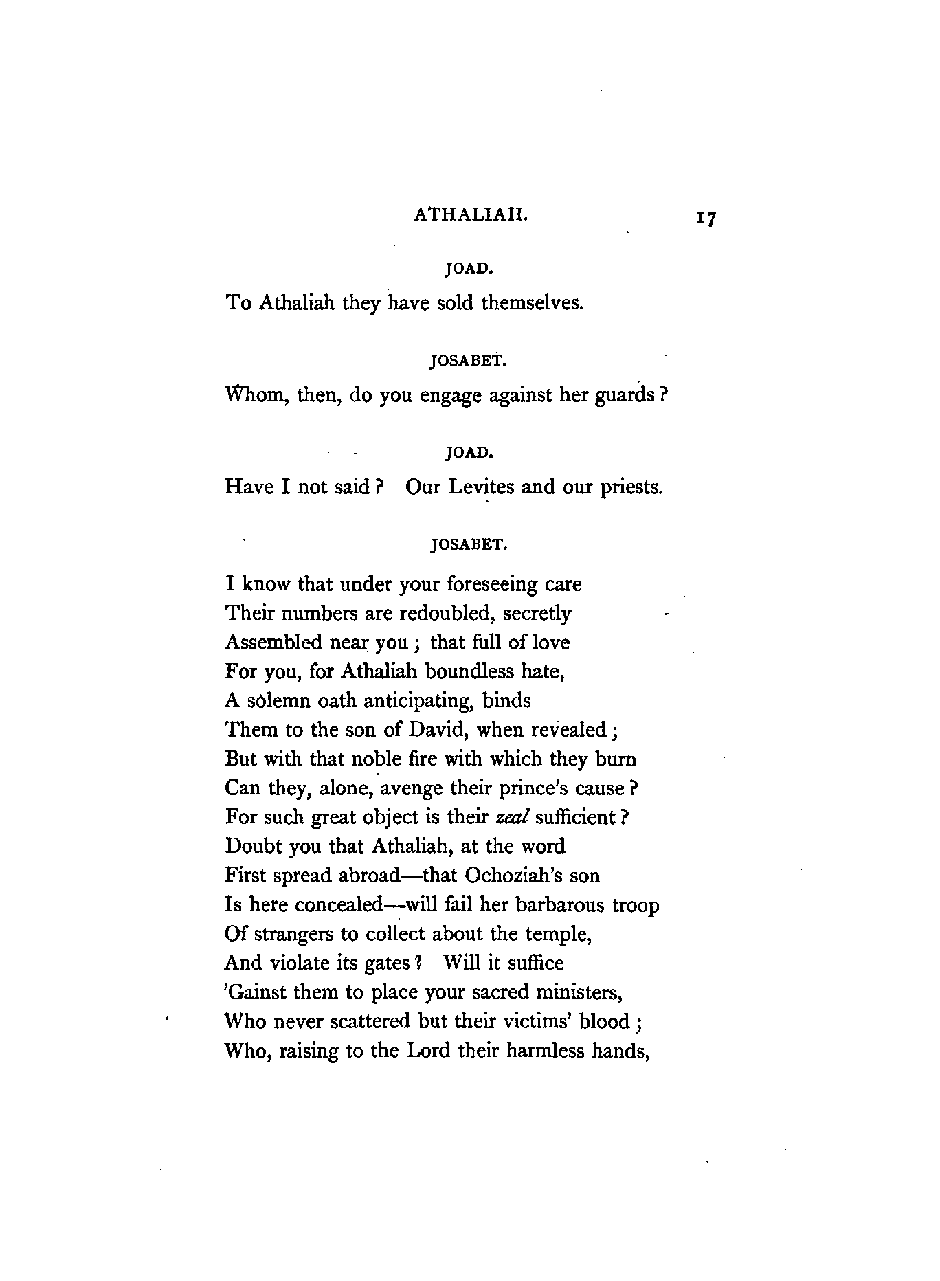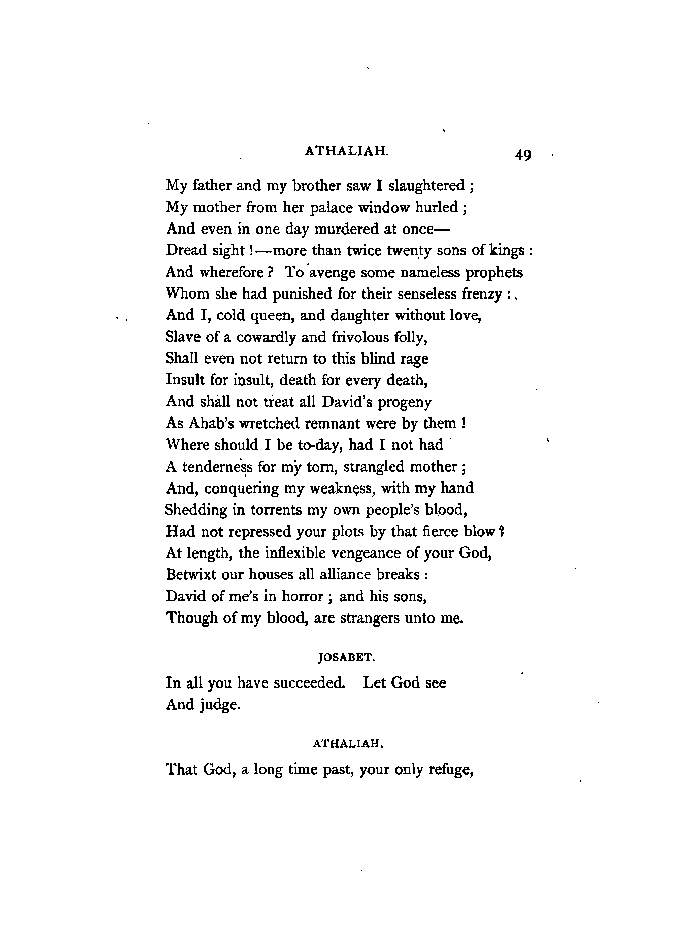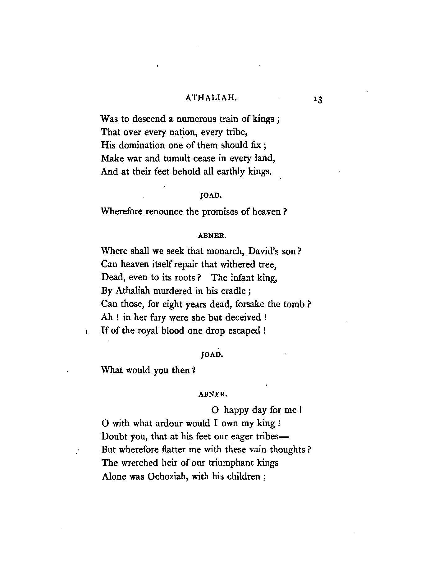 Racine, the author of Athalie (Athaliah), flourished in the latter half of the 17th century. At his appearance, Corneille, the great French Dramatist, was in the full splendour of his fame, whose rival he was afterwards recognised to be. Athalie is a Tragedy in rhyme, consisting of six Iambic feet, similar to the Alexandrine verse found occasionally in our English poets at the termination of a sentence or paragraph. Dryden, and a few others of less note, in the reign of Charles IL, introduced the rhyming drama to the English public; but the clank of its fetters was unpleasant to the British ear, which had become attuned to the freedom and majesty of blank verse. Blank verse, therefore, being our recognised vehicle of dramatic productions, has been employed in this translation. I did, however, intend in the first place to render the chorus into rhyme; but after maturer consideration it appeared to me that irregular blank verse would be more capable of tragic expression; and that it would also be more in harmony with the [4]Hebrew rhythm as represented by the scriptures, from which the plot was appropriated.