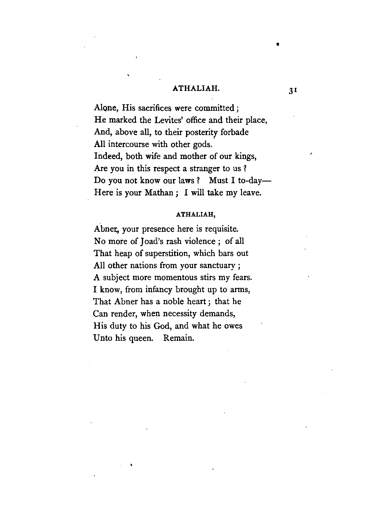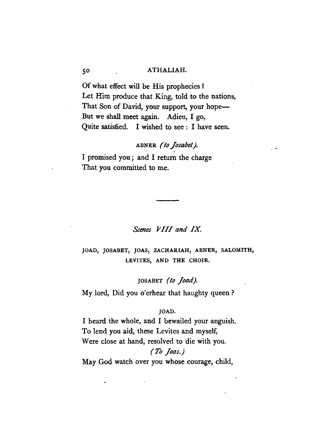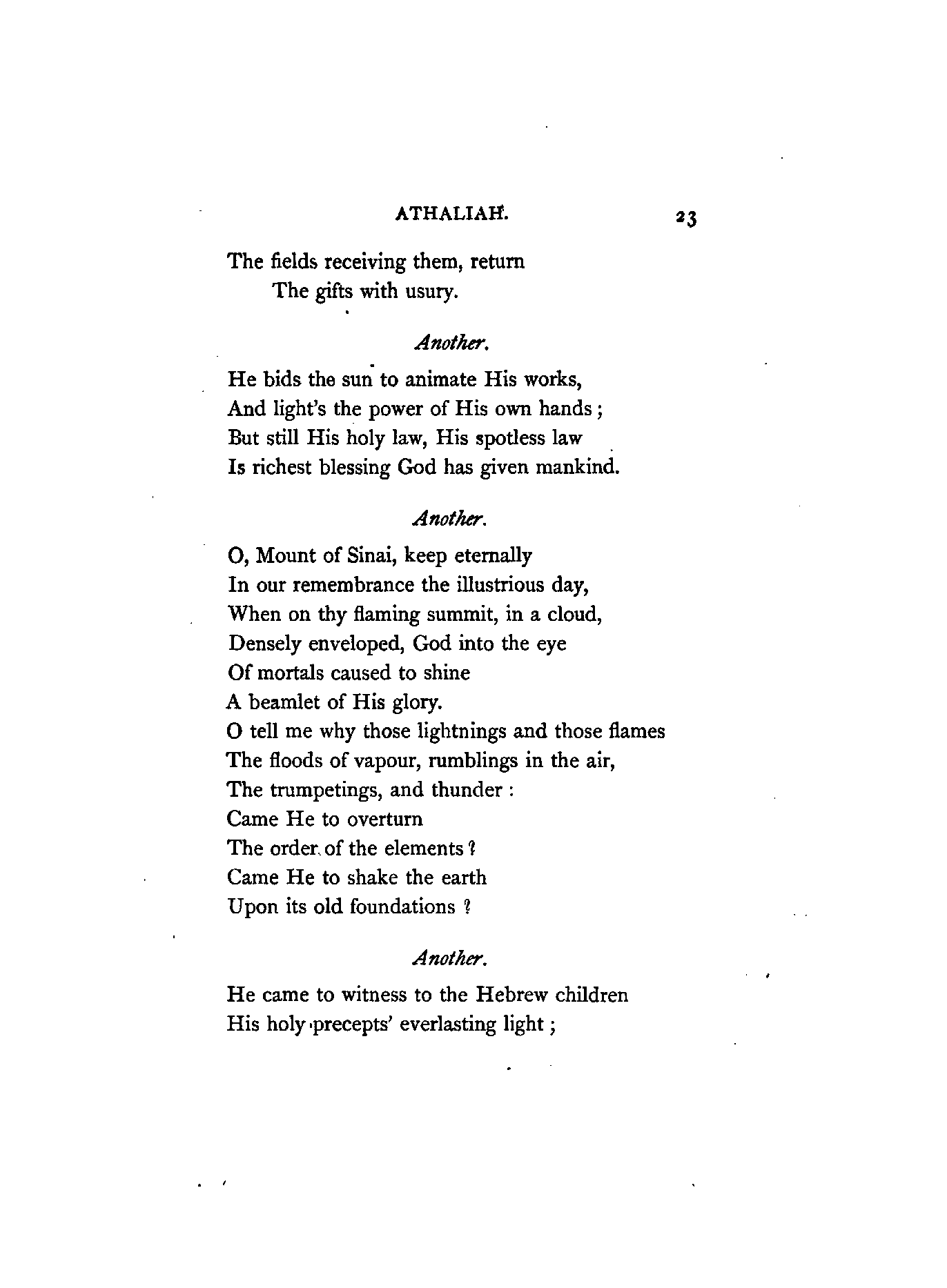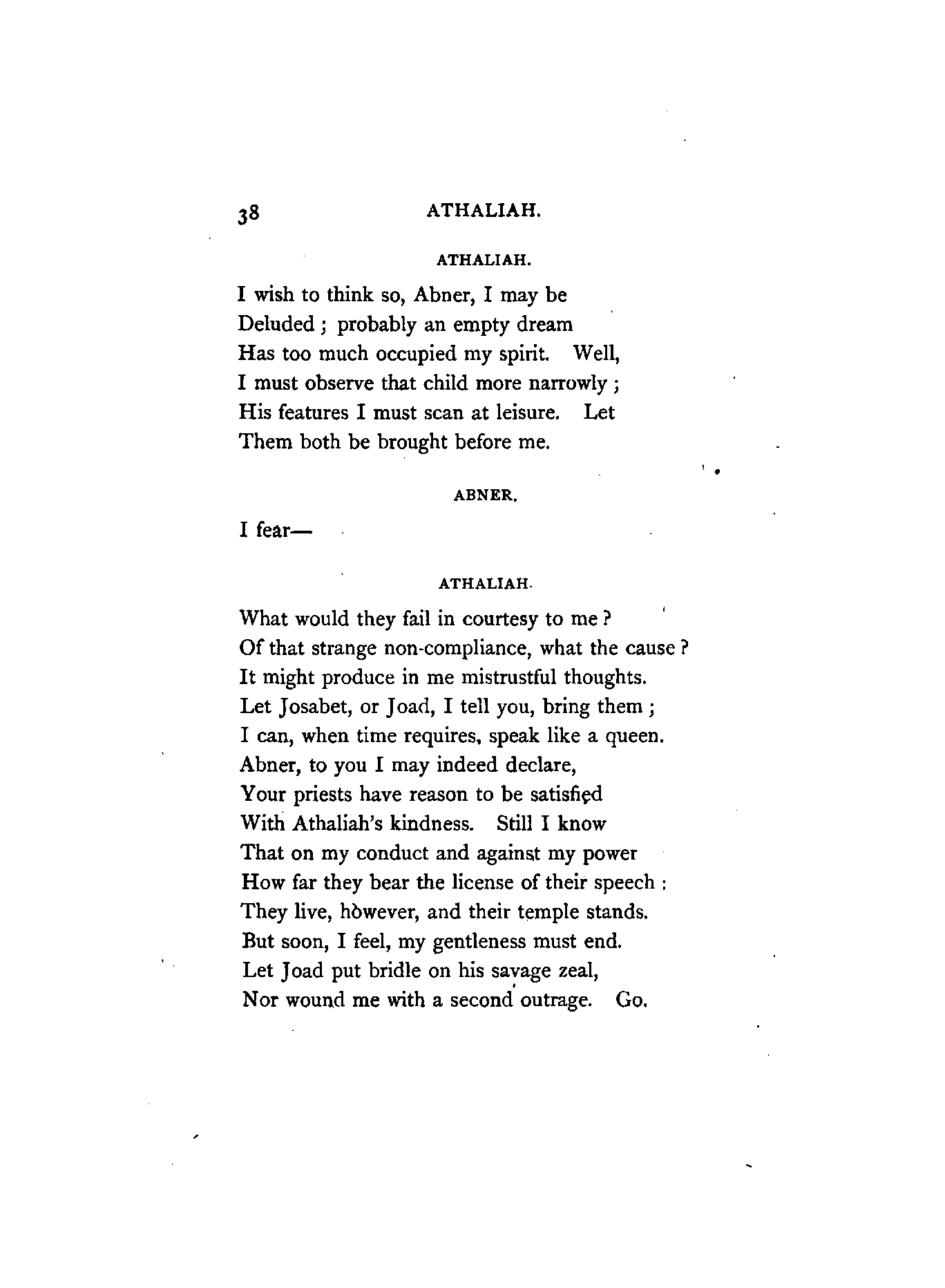 Racine, the author of Athalie (Athaliah), flourished in the latter half of the 17th century. At his appearance, Corneille, the great French Dramatist, was in the full splendour of his fame, whose rival he was afterwards recognised to be. Athalie is a Tragedy in rhyme, consisting of six Iambic feet, similar to the Alexandrine verse found occasionally in our English poets at the termination of a sentence or paragraph. Dryden, and a few others of less note, in the reign of Charles IL, introduced the rhyming drama to the English public; but the clank of its fetters was unpleasant to the British ear, which had become attuned to the freedom and majesty of blank verse. Blank verse, therefore, being our recognised vehicle of dramatic productions, has been employed in this translation. I did, however, intend in the first place to render the chorus into rhyme; but after maturer consideration it appeared to me that irregular blank verse would be more capable of tragic expression; and that it would also be more in harmony with the [4]Hebrew rhythm as represented by the scriptures, from which the plot was appropriated.