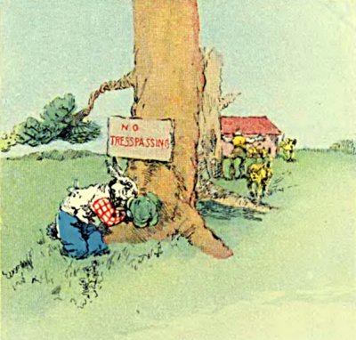 “Now, den, you done hear what I say. Dar wuz Mr. Man, yander wuz de gyarden, an’ here wuz ol’ Brer Rabbit.” Uncle Remus made a map of this part of the story by marking in the sand with his walking-cane. “Well, dis bein’ de case, what you speck gwineter happen? Nothin’ in de roun’ worl’ but what been happenin’ sence greens an’ sparrer-grass wuz planted in de groun’. Dey look fine an’ dey tas’e fine, an’ long to’rds de shank er de mornin’, Brer Rabbit ’ud creep thoo de crack er de fence an’ nibble at um. He’d take de greens, but leave his tracks, mo’ speshually right atter a rain. Takin’ an’ leavin’—it’s de way er de worl’.