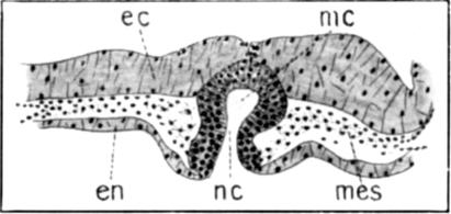 Figure 3A is a transverse section through this embryo near the anterior end of the enteron, ent, which cavity, cephalad to this region, is bluntly pointed. As seen in the figure the enteron is here wide from side to side, and is depressed dorso-ventrally except for a wide groove in the ventral wall. This groove is lined with rather more closely arranged cells, and marks the region where the mouth will break through at a somewhat later stage. A short distance caudad to this region the groove disappears and the pharynx is reduced to a shallow slit extending almost to the superficial ectoderm on either side; then the slit-like pharynx becomes suddenly reduced in a lateral and increased in a dorso-ventral direction, to assume the outline shown in figures 3B and 3C. At a point about one-third of the length of the embryo from the tip of the head, the enteron opens to the yolk-sac, so that what now may be called the foregut has this considerable extent. There is, however, not the slightest indication of a tail-fold, so that there is no inclosed hindgut at all. As is shown in figure 3D, the neurenteric canal, nc, still opens ventrally, though the medullary canal, mc, has now no dorsal opening to the exterior. The medullary canal continues for a short distance (about fifteen sections of five microns thickness) posterior to the opening of the neurenteric canal.