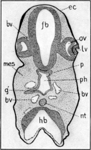 Followed caudad the pharynx becomes depressed until, in the region shown in figure 5B, it is a mere narrow slit, g, extending transversely across the embryo and opening through the gill clefts to the exterior on each side.