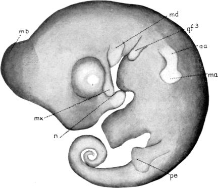 Since the head has now quite a reptilian form, the oral cavity, m, has more or less of the adult outline. A transverse groove near the anterior end of the lower jaw marks off the tongue, tn; and the rudiments of teeth are seen but not shown in the figure because of the low magnification used.