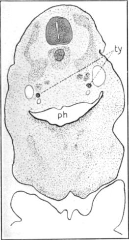 The widely-open mouth, m, leads, with no line of demarkation, into the pharynx, ph, which is of irregular outline and, as has been said, of much greater lateral than dorso-ventral diameter.