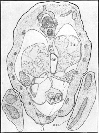 The profile of the liver, li, has, at this stage, about the same area and even outline as that of the lung. It lies, of course, on both sides of the enteron proper, and overlaps, anteriorly, as has been said, the posterior end of the lung.
