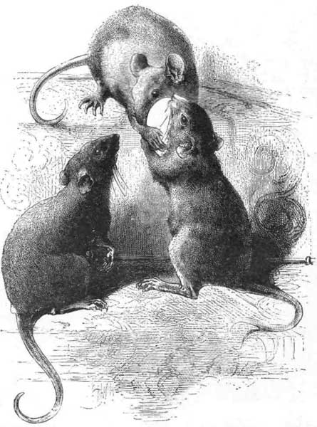 The rat bears little resemblance to the rats with which we are chiefly acquainted, namely, the black rat, the albino or white rat, and the brown rat. The other day, as I was walking by the river-side, I saw a beautiful little creature sitting on a stone in the stream, with a piece of succulent root between its forepaws, and nibbling its repast in perfect peace with every living thing. It was timid and innocent in the expression of its countenance. Its color was of a reddish brown. It was about as large as the common rat of the sewers, but its tail was much shorter, and covered with hair.