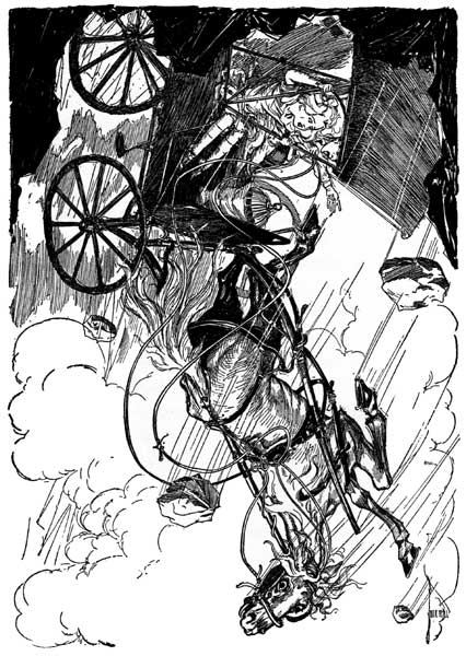 Suddenly there was a rending, tearing sound, and the earth split into another great crack just beneath the spot where the horse was standing. With a wild neigh of terror the animal fell bodily into the pit, drawing the buggy and its occupants after him.
