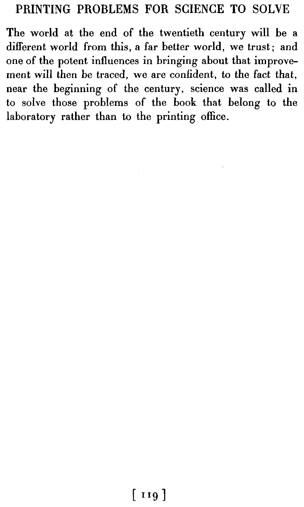 It is surely not an extreme assumption that the first duty of the printer is to the meaning of his author, and his second to esthetics; but shall we not rather say that his duty is to meet both demands, not by a compromise, but by a complete satisfaction of each? A difficult requirement, surely, but one that we are confident the twentieth-century printer will not permit his critics to pronounce impossible.