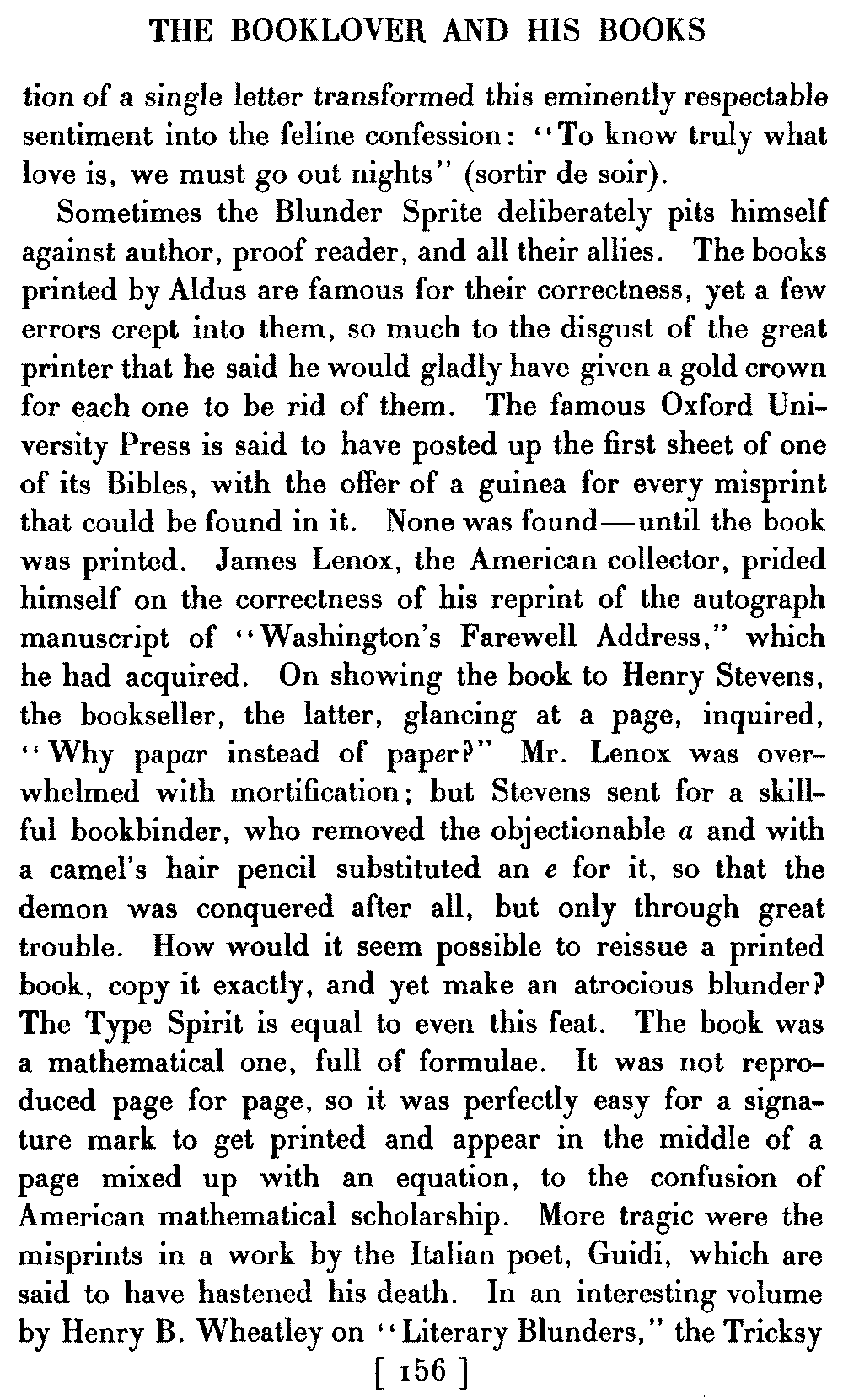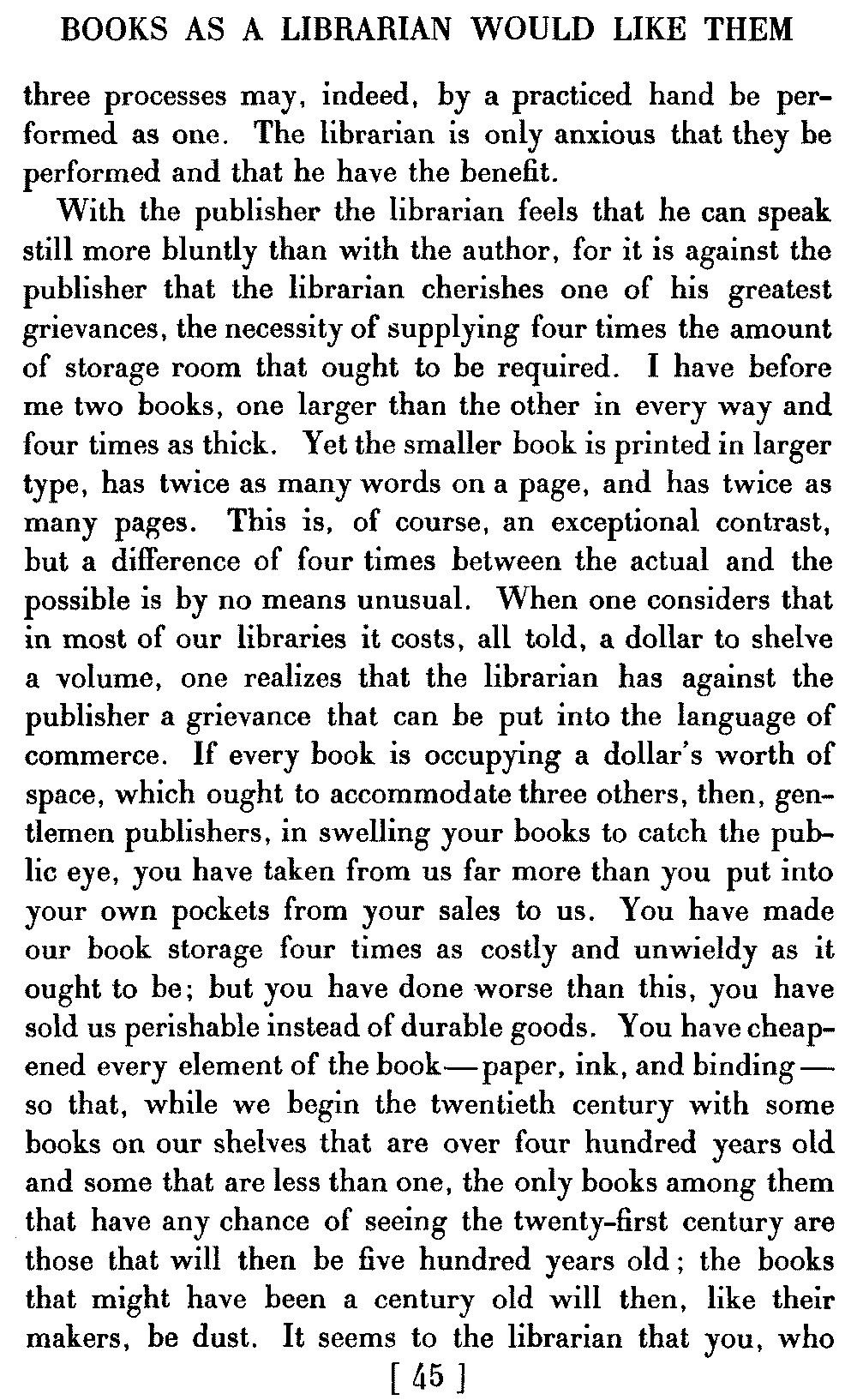 But to return to the advantages of type to the reader. Handwriting can make distinctions, such as punctuation and paragraphing, but print can greatly enforce them. The meaning of no written page leaps out to the eye; but this is the regular experience of the reader with every well-printed page. While printing can do nothing on a single page that is beyond the power of a skillful penman, its ordinary resources are the extraordinary ones of manuscript. It might not be physically impossible, for instance, to duplicate with a pen a page of the Century Dictionary, but it would be practically impossible, and, if the pen were our only resource, we never should have such a marvel of condensation and distinctness as that triumph of typography in the service of scholarship.