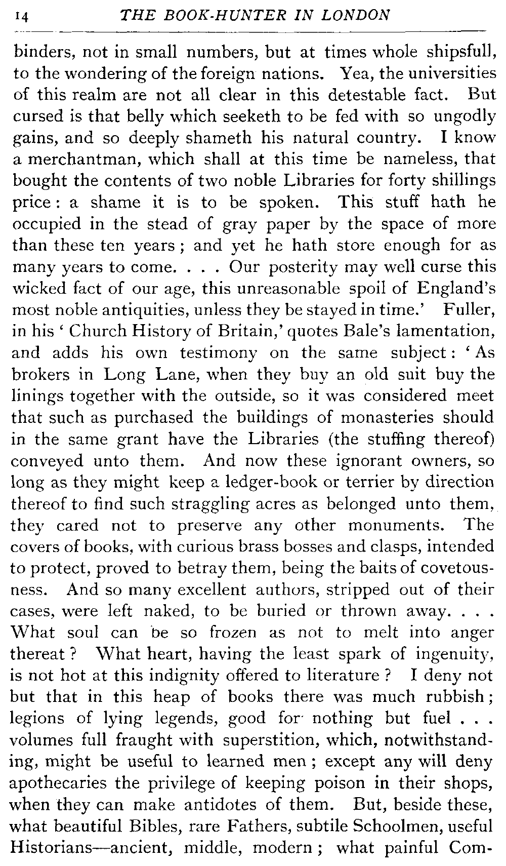 It is infinitely easier to name those who have collected books in this vast and unwieldy London of ours, than it is to classify them. To adopt botanical phraseology, the genus is defined in a word or two, but the species, the varieties, the hybrids, and the seedlings, how varied and impossible their classification! Most men have bought books, some have read a few, and others many; but beyond this rough grouping together we shall not attempt anything. One thing, however, the majority of book-collectors agree in, and that is in regarding their own generation as a revolution—they have, as Butler has described it in his picture of an antiquary, 'a great value for that which is past and gone, like the madman that fell in love with Cleopatra.'
